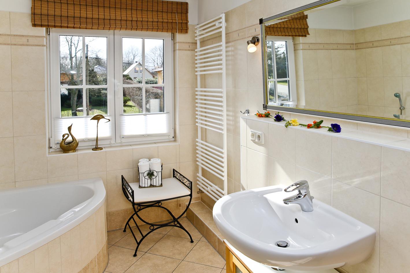 Das Ferienhaus verfügt über 3 Schlafzimmer und ein Gäste-WC. Ein weiteres, großes Bad mit Dusche, großer Wanne und Sauna (gegen Entgelt) finden Sie im Obergeschoss.