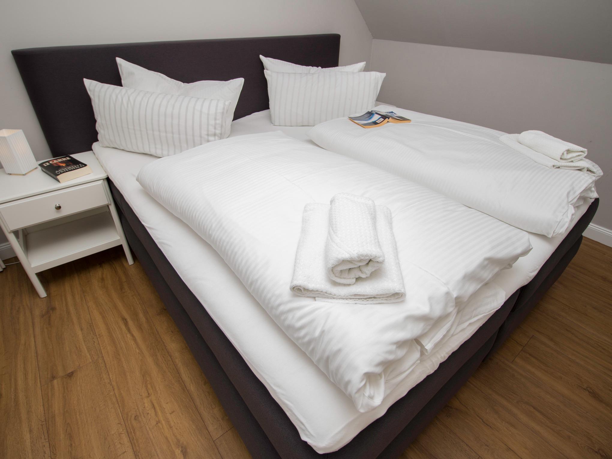 Das moderne Schlafzimmer ist mit dem "Boxspringbett des Jahres 2015" aus Belgien und zahlreichen Stauraum-Möglichkeiten ausgestattet.