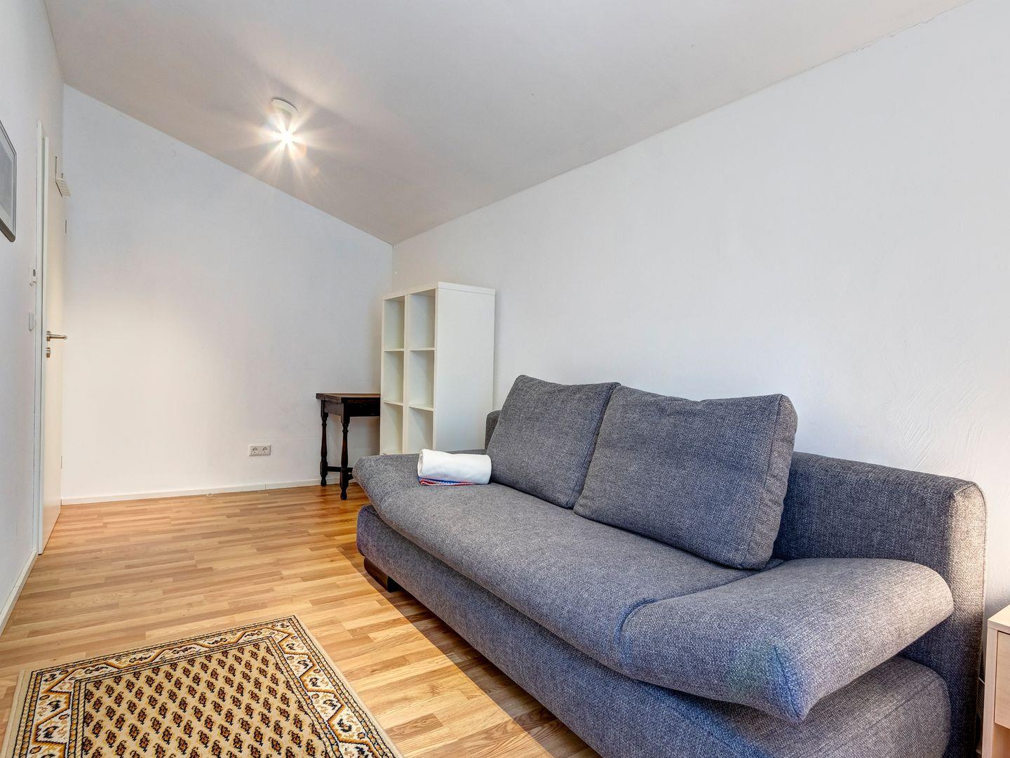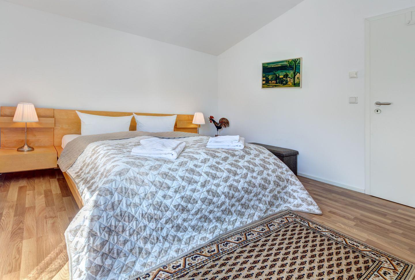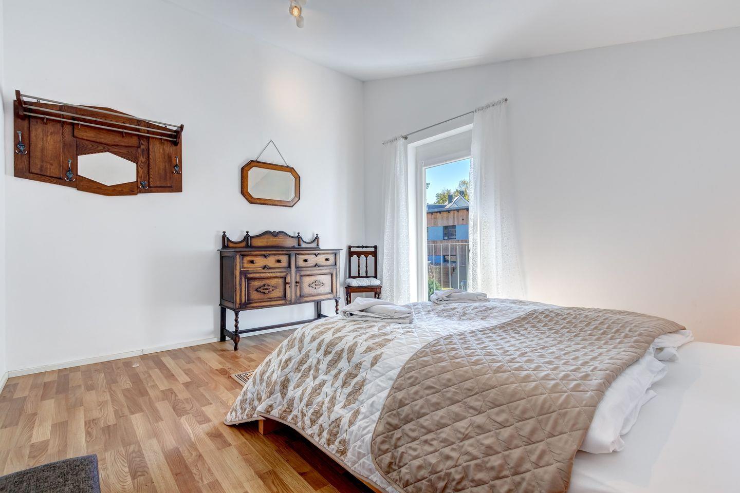 Das Obergeschoss bietet ein großzügiges Schlafzimmer mit einem gemütlichen Doppelbett sowie ein kleineres Zimmer mit einem praktischen Schlafsofa. Parkplatz befindet sich am Haus.