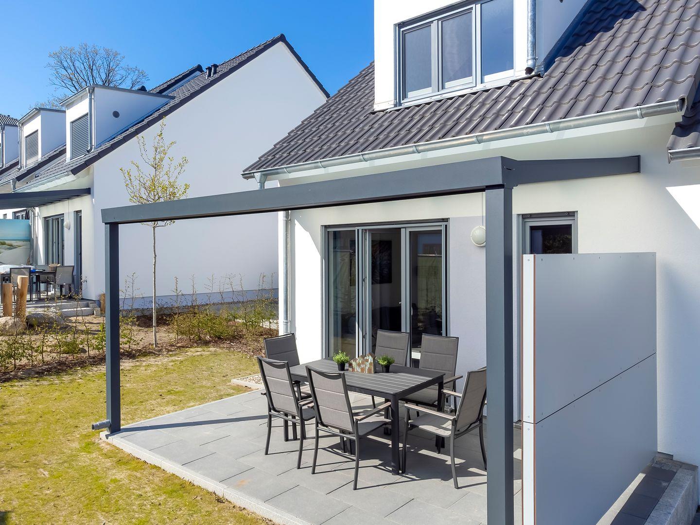 Der großzügige, offene Wohn- und Essbereich mit einer voll ausgestatteten Küche lädt zum Verweilen ein. Von hier aus gelangen Sie auf die große Sonnenterrasse, die sich auf der Südseite des Hauses befindet. Sonnenschutz und Gartenmöbel sorgen für zusätzlichen Komfort.