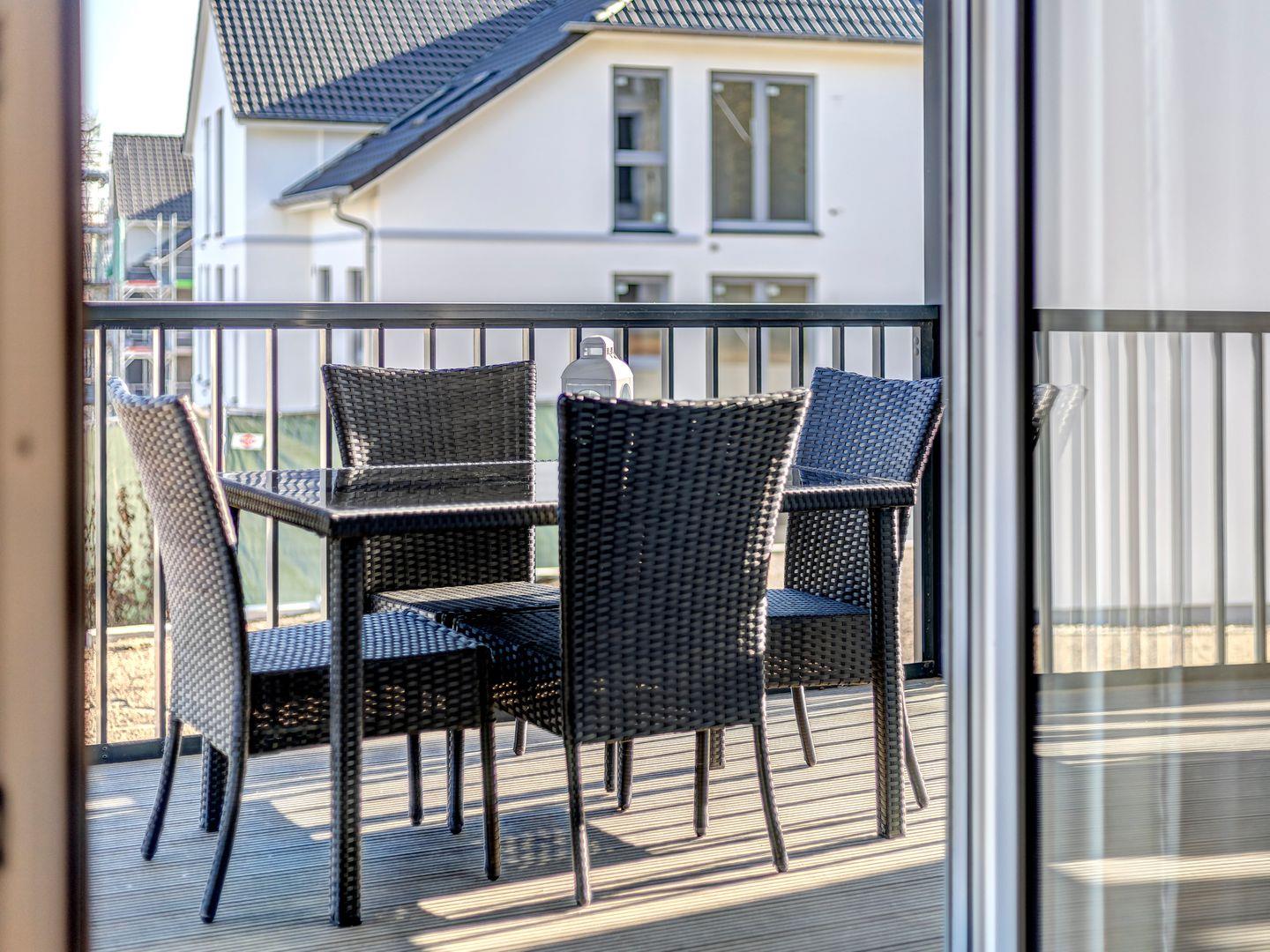 Der lichtdurchflutete Wohn- und Essbereich öffnet sich zum Balkon mit Südost-Ausrichtung, Esstisch für vier Personen und gemütlichen Sitzgelegenheiten. Genießen Sie Ihr Frühstück oder entspannen Sie mit einem Glas Wein am Abend.