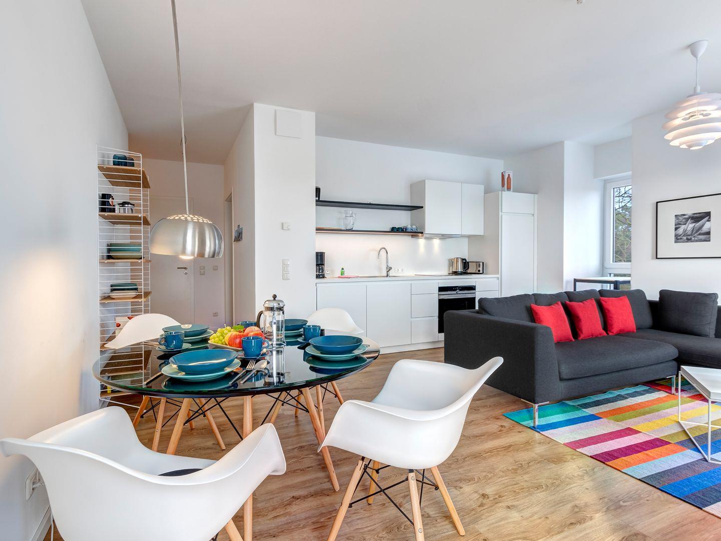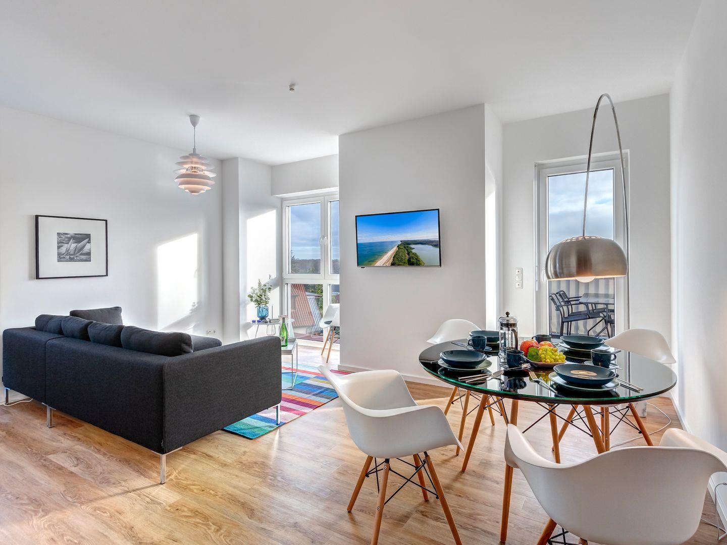 Modern, hochwertig und ein Hauch Minimalismus über den Dächern von Kölpinsee - dieses traumhafte Appartement im Dachgeschoss begrüßt maximal 4 Personen aufs herzlichste. Auf 80 Quadratmeter Wohnfläche erwarten Sie ein großzügiger Wohn-/Essbereich. Die große Sofalandschaft besticht durch den herrlichen Blick in den Ort. Der runde Esstisch mit den bequemen Schalensesseln empfängt Sie zum gemeinsamen Frühstück.
