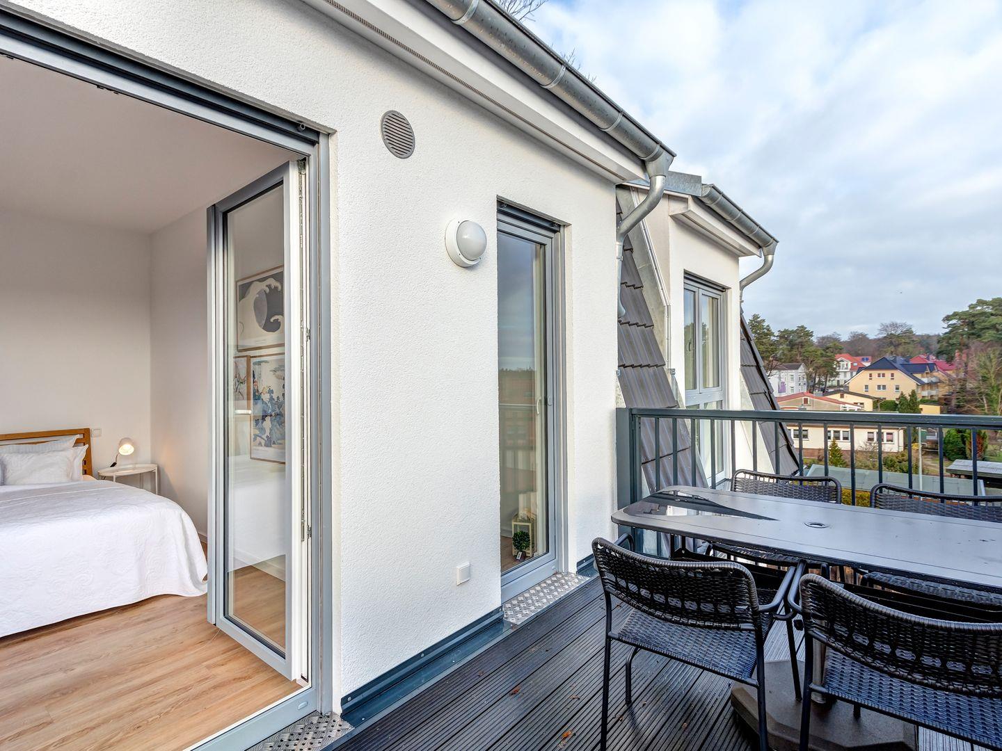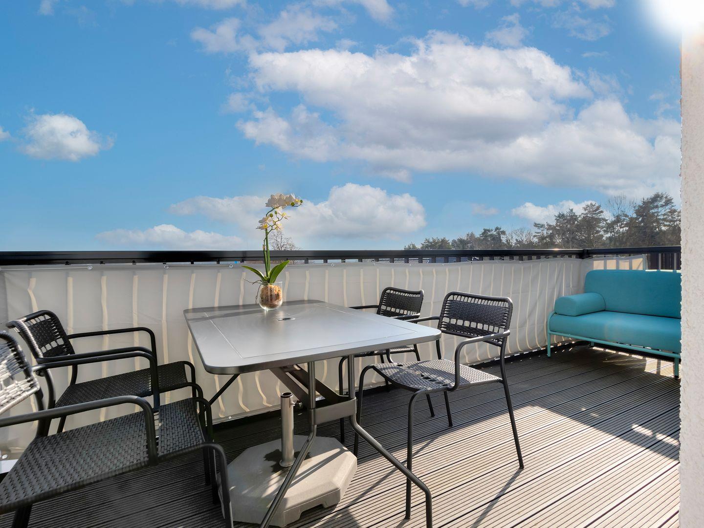 Der großzügige Balkon bietet neben einem Tisch mit 4 Stühlen noch zusätzlich Platz für ein Outdoor Sofa. Vom Balkon haben Sie eine wunderbare Aussicht auf den Kölpinsee. Ein Appartement zum Wohlfühlen – wir freuen uns auf Sie.