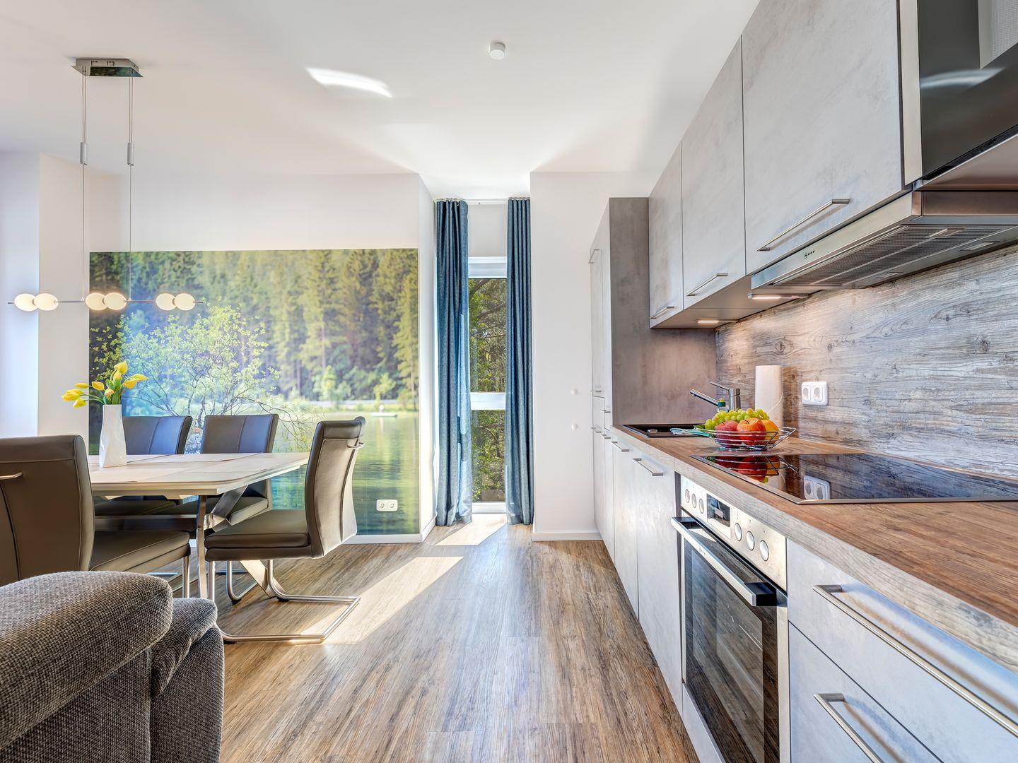 Im Wohnzimmer erwartet Sie eine gemütliche, elektrisch ausziehbare Sitzecke sowie ein Smart TV, ebenso wie im „Kinderzimmer“. Kostenfreies WLAN sorgt für Unterhaltung. Die moderne, voll ausgestattete Küche mit Essbereich lädt zu gemeinsamen Mahlzeiten ein. Zudem gibt es zwei stilvolle Duschbäder mit Fön.