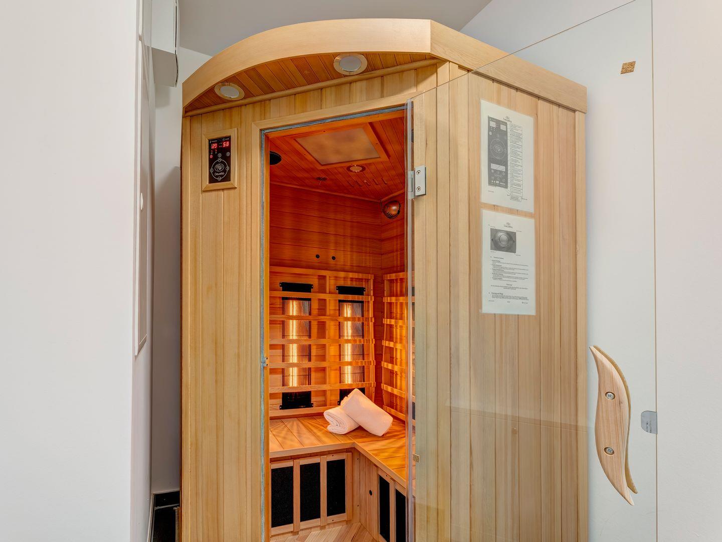 Für Entspannung pur steht Ihnen eine Infrarotsauna zur Verfügung, die Platz für zwei Personen bietet und auf bis zu 60 Grad erwärmt werden kann. Eine Waschmaschine ist ebenfalls vorhanden, um Ihren Aufenthalt so bequem wie möglich zu gestalten.