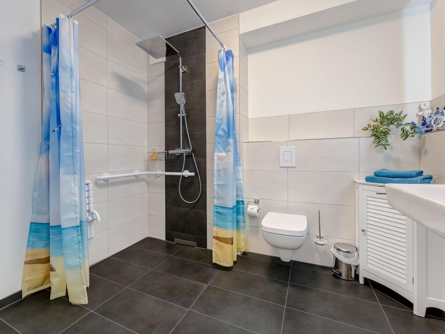 Das barrierefreie Badezimmer ist mit einer rollstuhlgerechten Dusche ausgestattet, die über einen integrierten Sitz, Griffe und einen drehbaren Duschkopf verfügt. Es gibt keine festen Duschwände, was die Nutzung besonders komfortabel macht.