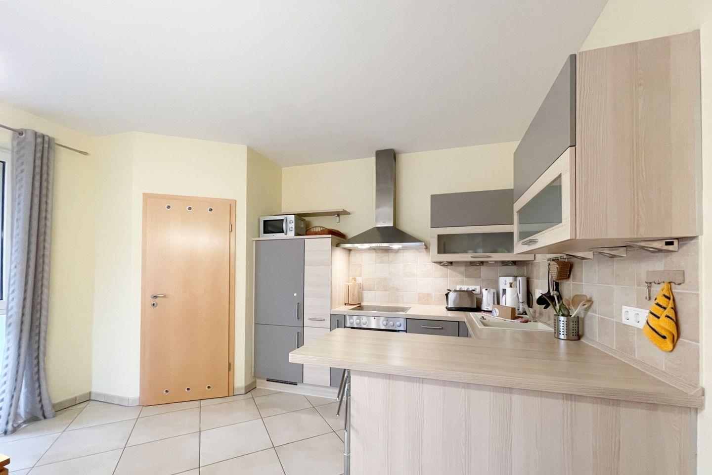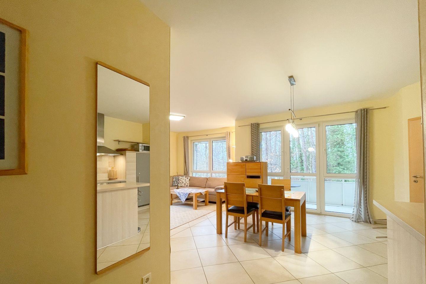 Die Wohnung befindet sich im ersten Stock eines gepflegten Mehrfamilienhauses und überzeugt durch eine lichtdurchflutete, offene Raumgestaltung. Der einladende Wohnbereich ist mit einer gemütlichen Sofaecke ausgestattet, die perfekt ist, um nach einem erlebnisreichen Tag zu entspannen. Ein großer Esstisch lädt zu gemeinsamen Mahlzeiten ein, während die vollständig ausgestattete Küche mit modernen Geräten wie einer Spülmaschine, einem Backofen und einem Kühlschrank dafür sorgt, dass Sie sich im Urlaub wie zu Hause fühlen.