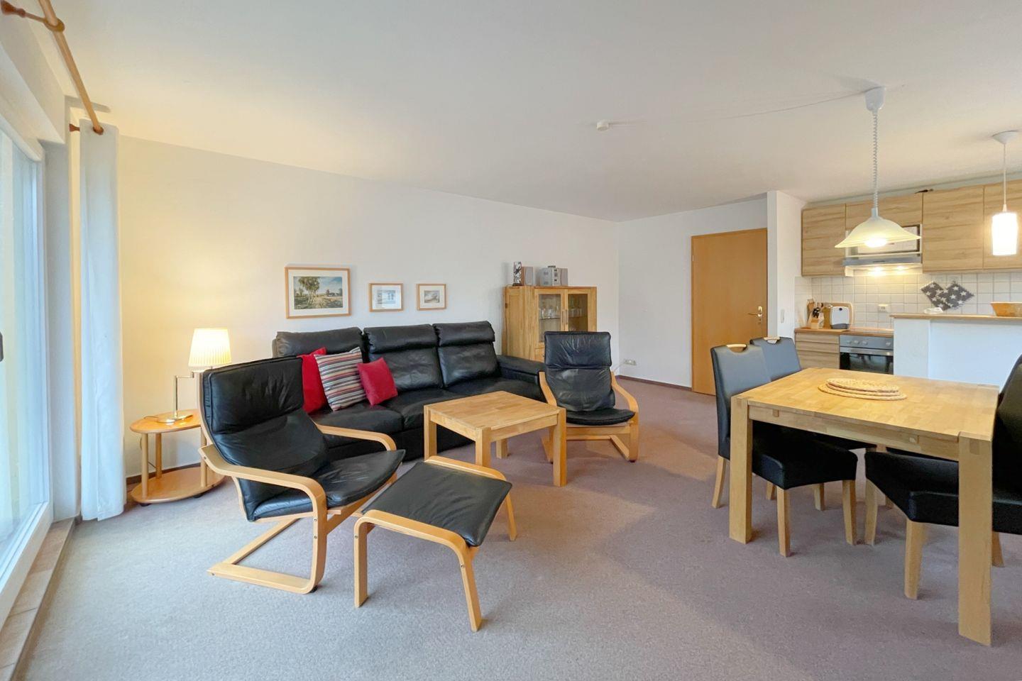 Bei Ihrer Ankunft werden Sie sofort die einladende Atmosphäre und die geschmackvolle Einrichtung der Wohnung schätzen. Mit zwei komfortablen Schlafzimmern, einem hellen und offenen Wohnbereich und einer gut ausgestatteten Küche lädt diese Ferienwohnung dazu ein, sich wie zu Hause zu fühlen. Der offene Wohn-/Essbereich ist der perfekte Ort, um gemeinsame Mahlzeiten zu genießen oder nach einem Tag am Strand zu entspannen. Genießen Sie die Vorzüge einer voll ausgestatteten Küche, die mit modernen Geräten wie einem Herd, Backofen, Geschirrspüler und Mikrowelle ausgestattet ist. Die Einrichtung umfasst auch eine gemütliche Sofaecke, in der Sie sich zurücklehnen und fernsehen können oder das kostenfreie WLAN nutzen können, um Ihre Erlebnisse zu teilen.