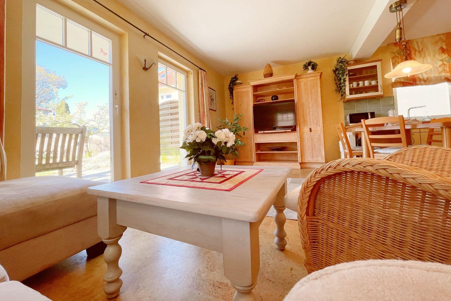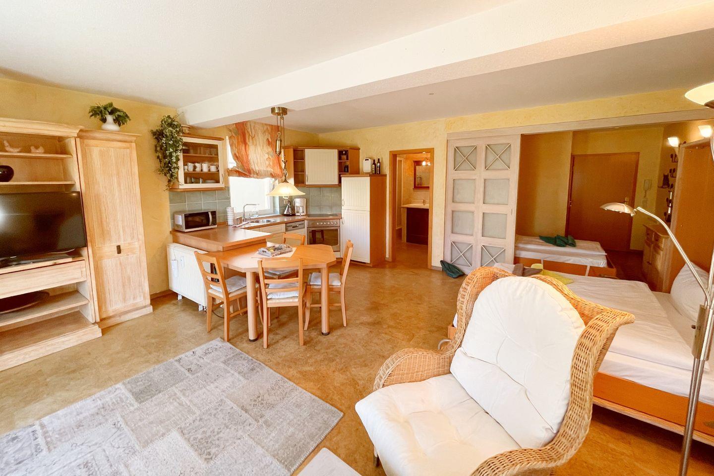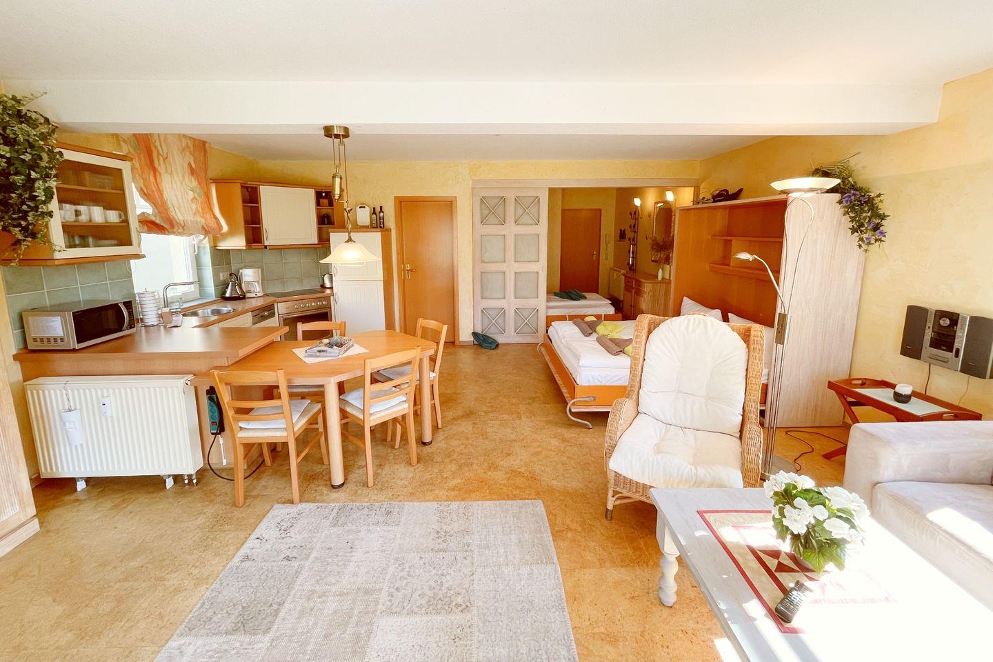Das 1,5-Zimmer-Apartment im Erdgeschoss begrüßt Sie mit einer Sonnenterrasse in Südlage. Sehr ruhig und nur 3 Gehminuten von der Ostsee entfernt, gelegen. Das Wohnzimmer mit offener Küche, Essecke, bequemer Couch und einem Schrankbett, bildet das Herzstück dieses Apartments. Im Vorraum befindet sich ein weiteres Schrankbett, für die 3te Person, das mittels Schiebetür, vom Wohnzimmer, getrennt werden kann. In dem modernen Duschbad befindet sich neben dem WC ein doppelter Waschtisch mit Spiegel.