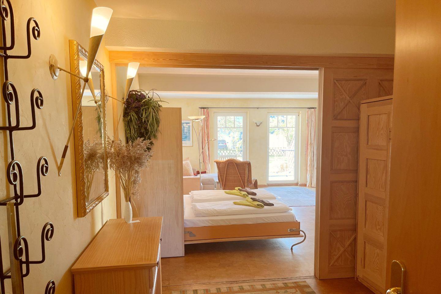 Das 1,5-Zimmer-Apartment im Erdgeschoss begrüßt Sie mit einer Sonnenterrasse in Südlage. Sehr ruhig und nur wenige Gehminuten von der Ostsee entfernt. Das Wohnzimmer mit offener Küche, Essecke, bequemer Couch und einem Schrankbett, bildet das Herzstück dieses Apartments. Im Vorraum befindet sich ein weiteres Schrankbett, für die 3te Person, das mittels Schiebetür, vom Wohnzimmer, getrennt werden kann. In dem modernen Duschbad befindet sich neben dem WC ein doppelter Waschtisch mit Spiegel.