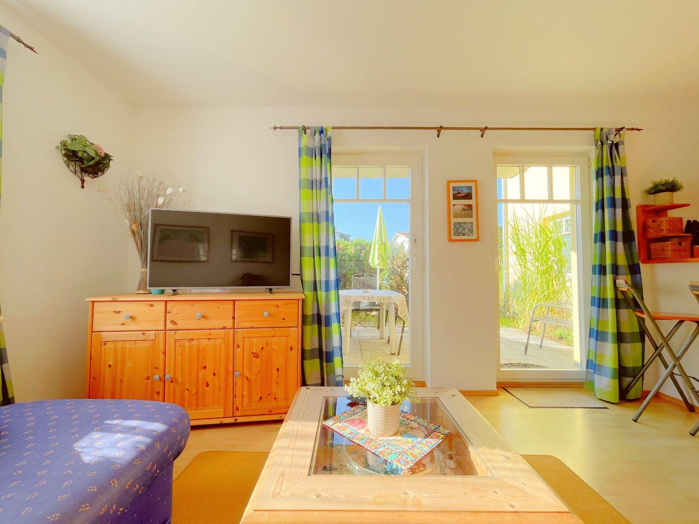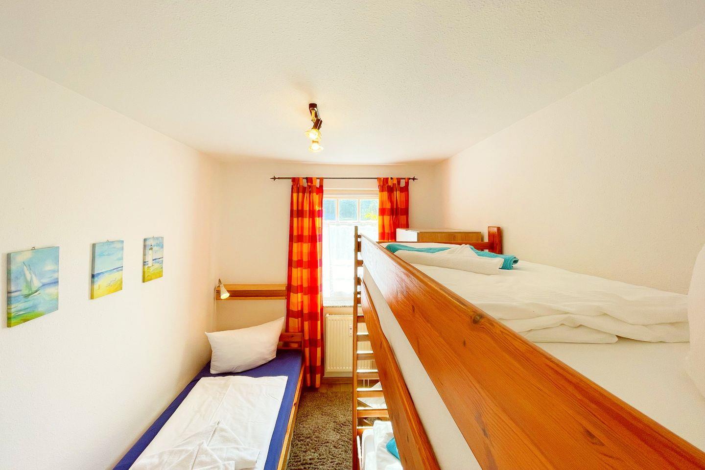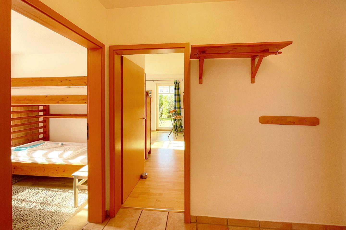 Das 3-Zimmer-Apartment im Erdgeschoss begrüßt Sie mit einer Sonnenterrasse in Südlage.Sehr ruhig und nur 3 Gehminuten von der Ostsee entfernt, gelegen. Das Wohnzimmer mit offener Küche, Essecke und bequemer Couch, bildet das Herzstück dieses Apartments. Ein Schlafzimmer ist mit einem Doppelbett, das andere ist mit einem Doppelstockbett und einem Einzelbett ausgestattet. In dem modernen Duschbad befindet sich neben dem WC ein Waschtisch mit Spiegel.