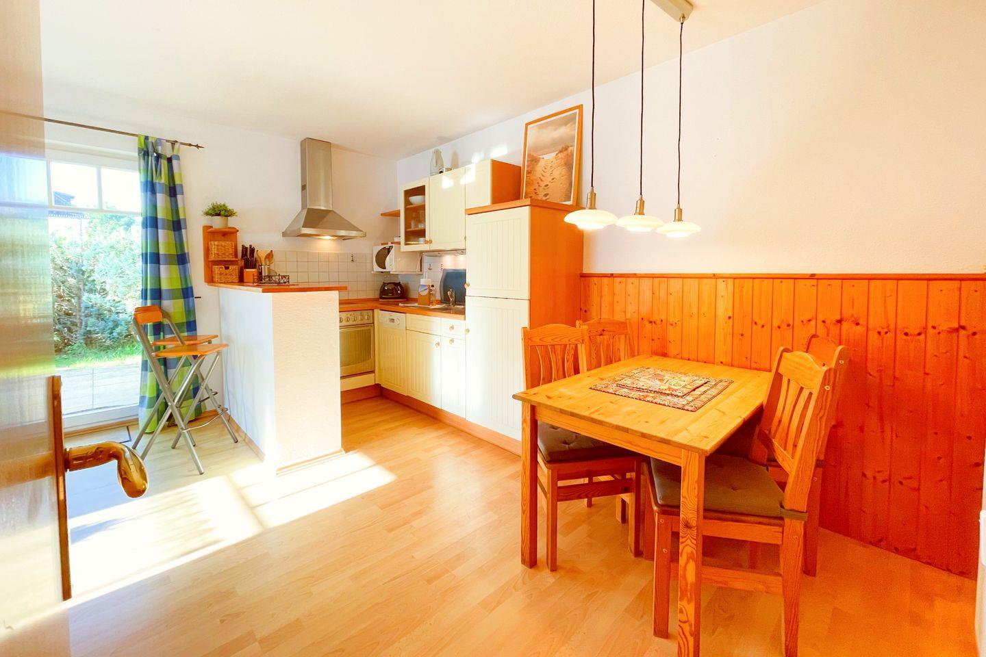 Das 3-Zimmer-Apartment im Erdgeschoss begrüßt Sie mit einer Sonnenterrasse in Südlage. Sehr ruhig und nur wenige Gehminuten von der Ostsee entfernt. Das Wohnzimmer mit offener Küche und Frühstücks Tresen für 2 Personen, Essbereich für 4 Personen und einer bequemen Couchecke, bildet das Herzstück dieses Apartments. Ein Schlafzimmer ist mit einem Doppelbett und Kleiderschrank, das andere ist mit einem Doppelstockbett, einem Einzelbett und Kleiderschrank ausgestattet. In dem modernen Duschbad befindet sich neben dem WC ein Waschbecken mit Spiegel.
