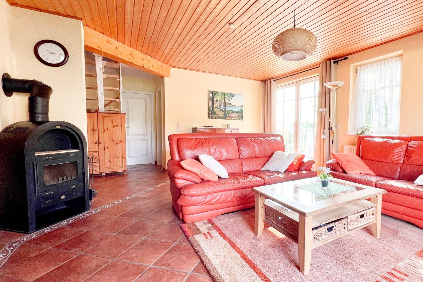 Die Wohnung besteht aus zwei geschmackvoll eingerichteten Schlafzimmern, die Ihnen erholsame Nächte garantieren. Das helle Wohnzimmer mit einer gemütlichen Sofaecke und einem Kaminofen lädt zum Verweilen ein und sorgt für eine angenehme Atmosphäre, besonders an kalten Abenden. Von hier aus gelangen Sie in die offene Küche, die mit modernen Geräten inklusive Cerankochfeld, Backofen, Spülmaschine und Kühlschrank ausgestattet ist. Sie können Ihre Lieblingsgerichte zubereiten und diese am Esstisch im Essbereich genießen.