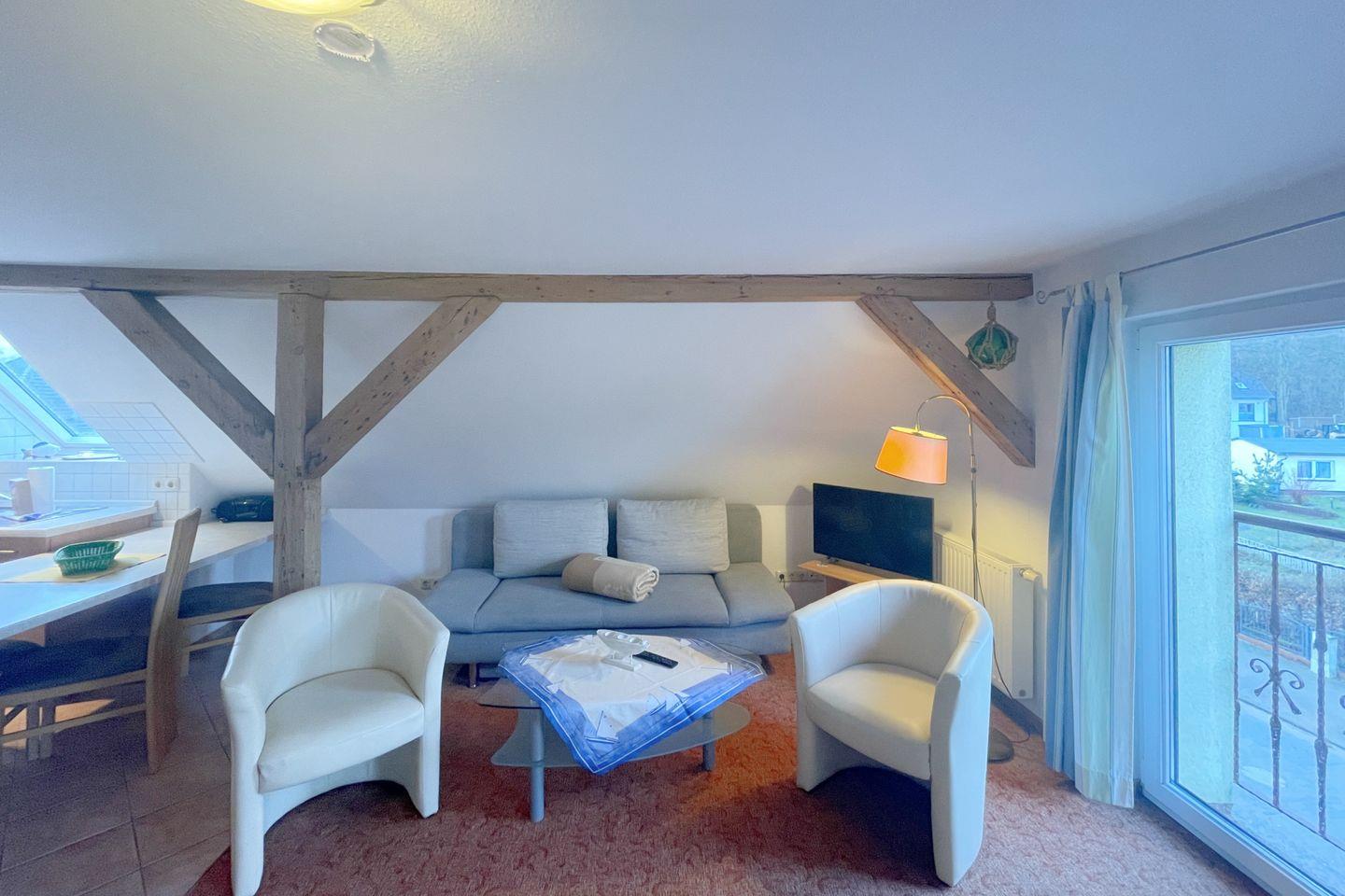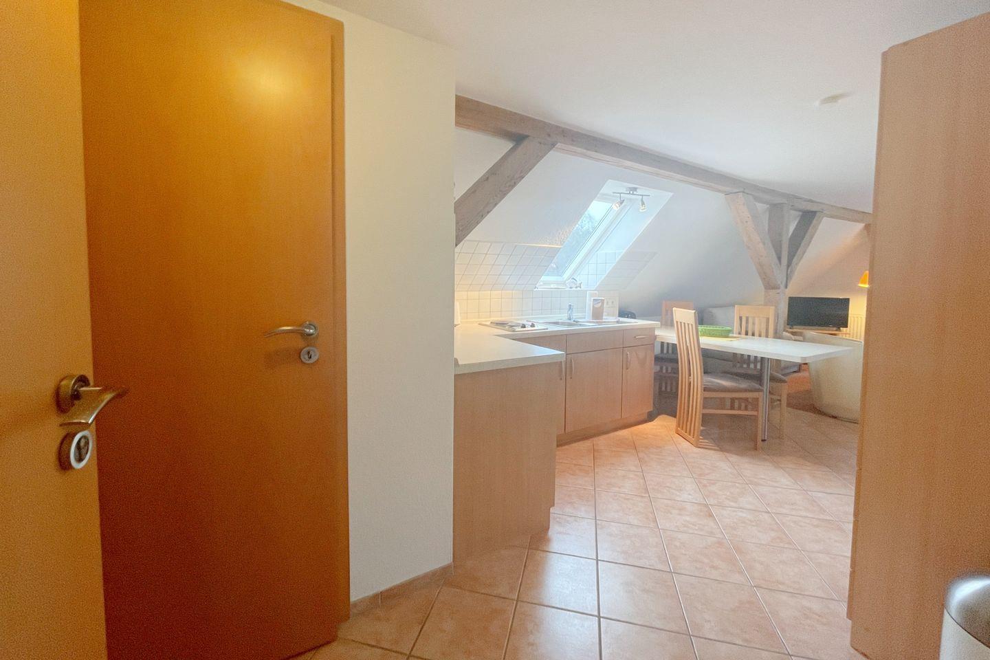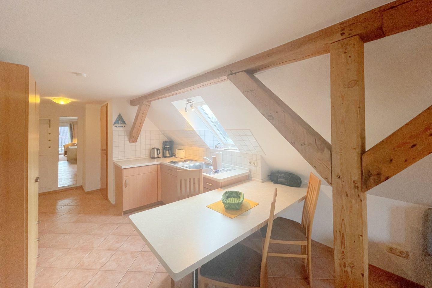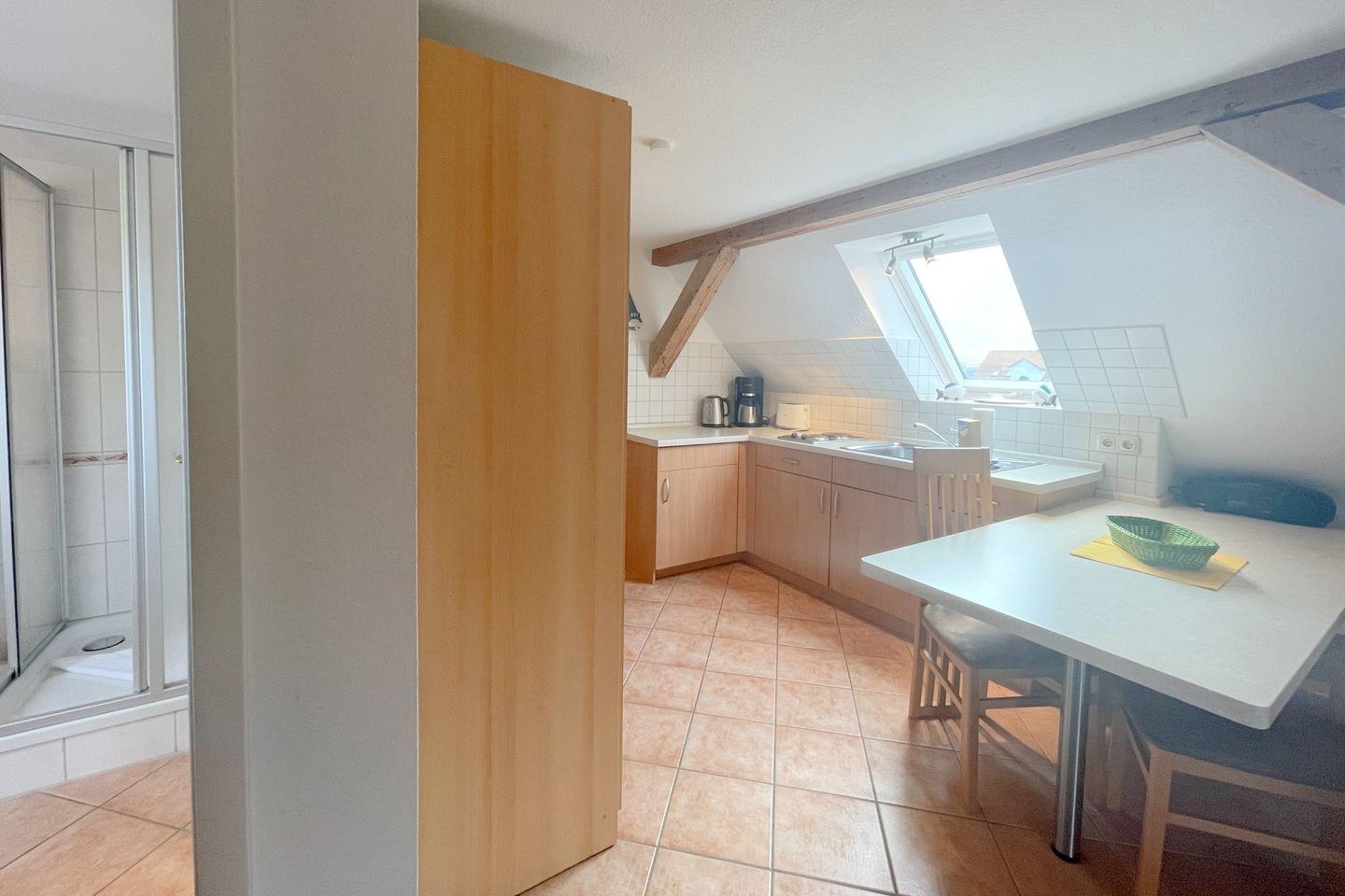 Im 2. Obergeschoss gelegen, bietet das Haus Antje "Studio" einen offenen Wohnbereich, der mit einer komfortablen Sofaecke, einem Esstisch und einem Fernseher ausgestattet ist. Die große Fensterfront sorgt für viel Tageslicht und einen wunderbaren Blick auf die Umgebung. Eine gut ausgestattete Küche mit allen notwendigen Küchenutensilien, einem 2-Platten-Herd, Mikrowelle, Kühlschrank mit Gefrierfach und einer Kaffeemaschine ermöglicht es Ihnen, sich auch während Ihres Urlaubs kulinarisch verwöhnen zu lassen.
