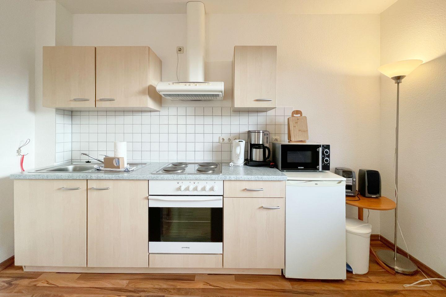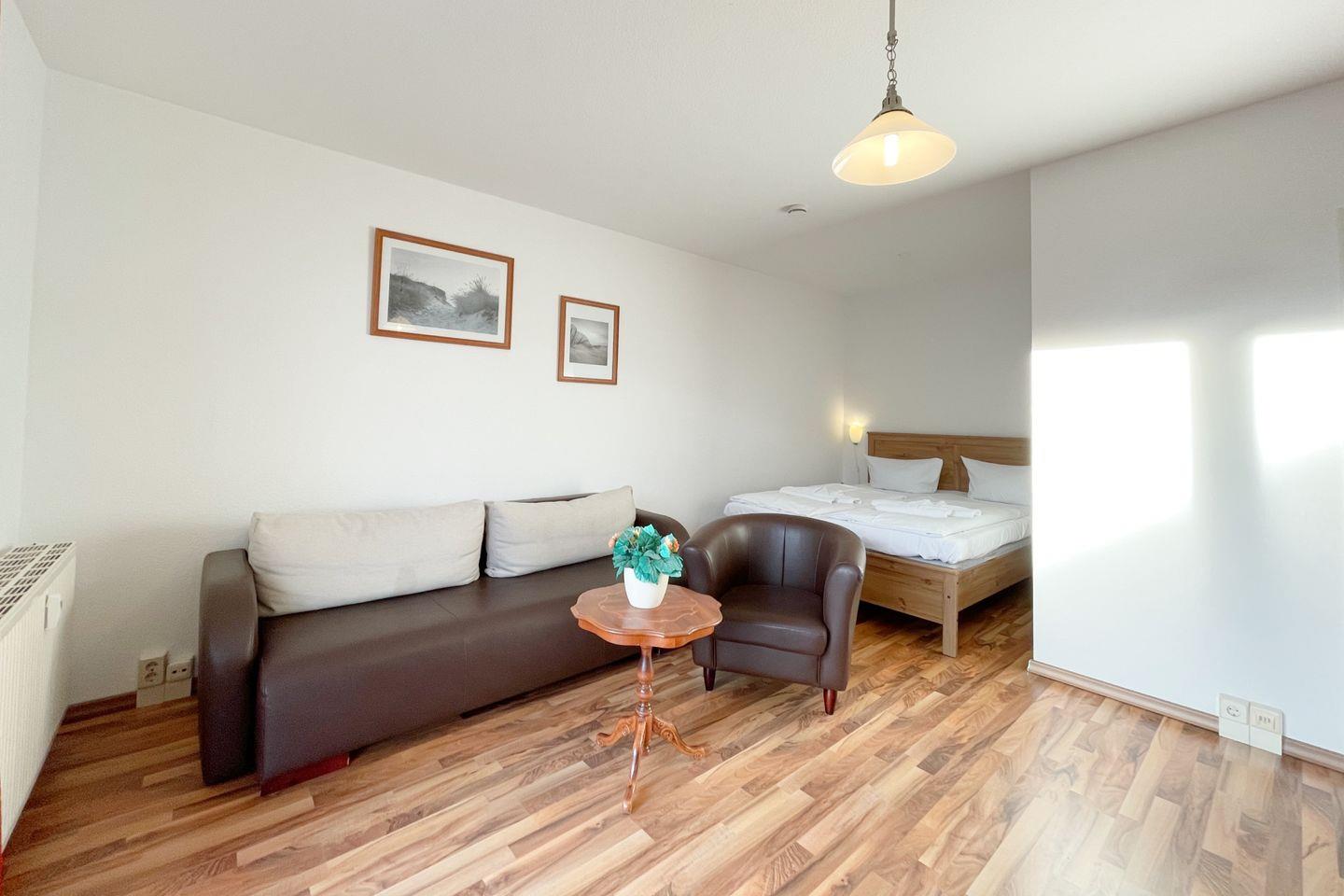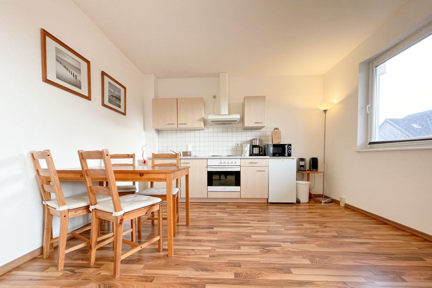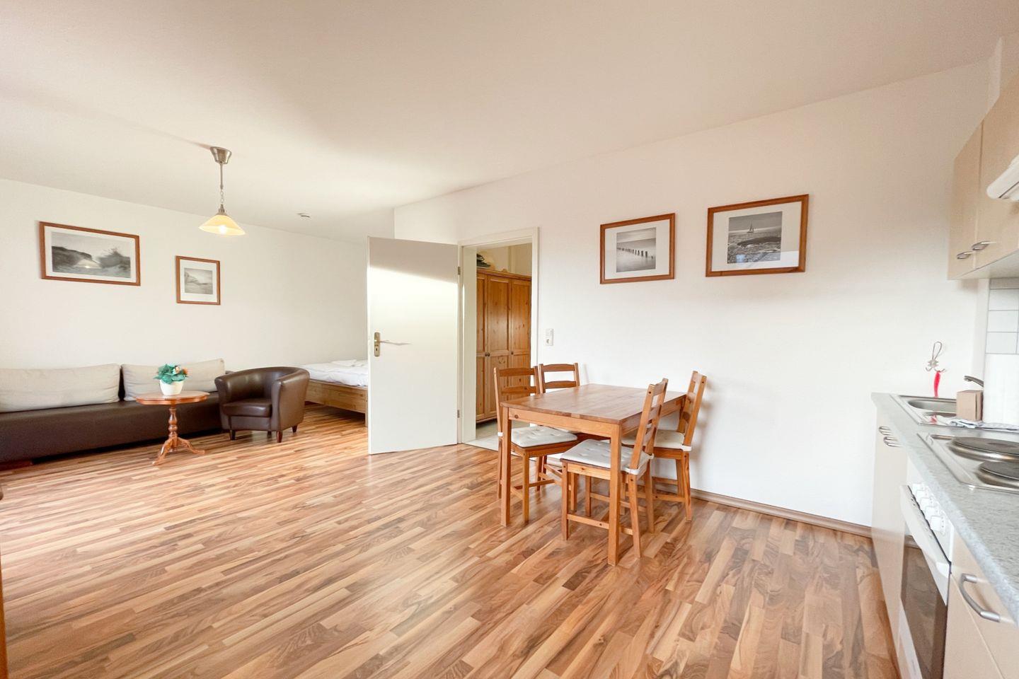 Die Wohnung verfügt über ein gemütliches und einladendes Wohnzimmer mit einer komfortablen Sofaecke und einer integrierten Schlafnische. Genießen Sie die offene Küche, die mit allen nötigen Annehmlichkeiten wie einem Herd, Backofen, Kühlschrank und Geschirrspüler ausgestattet ist. Hier können Sie leckere Mahlzeiten zubereiten und gemeinsam am Esstisch speisen.