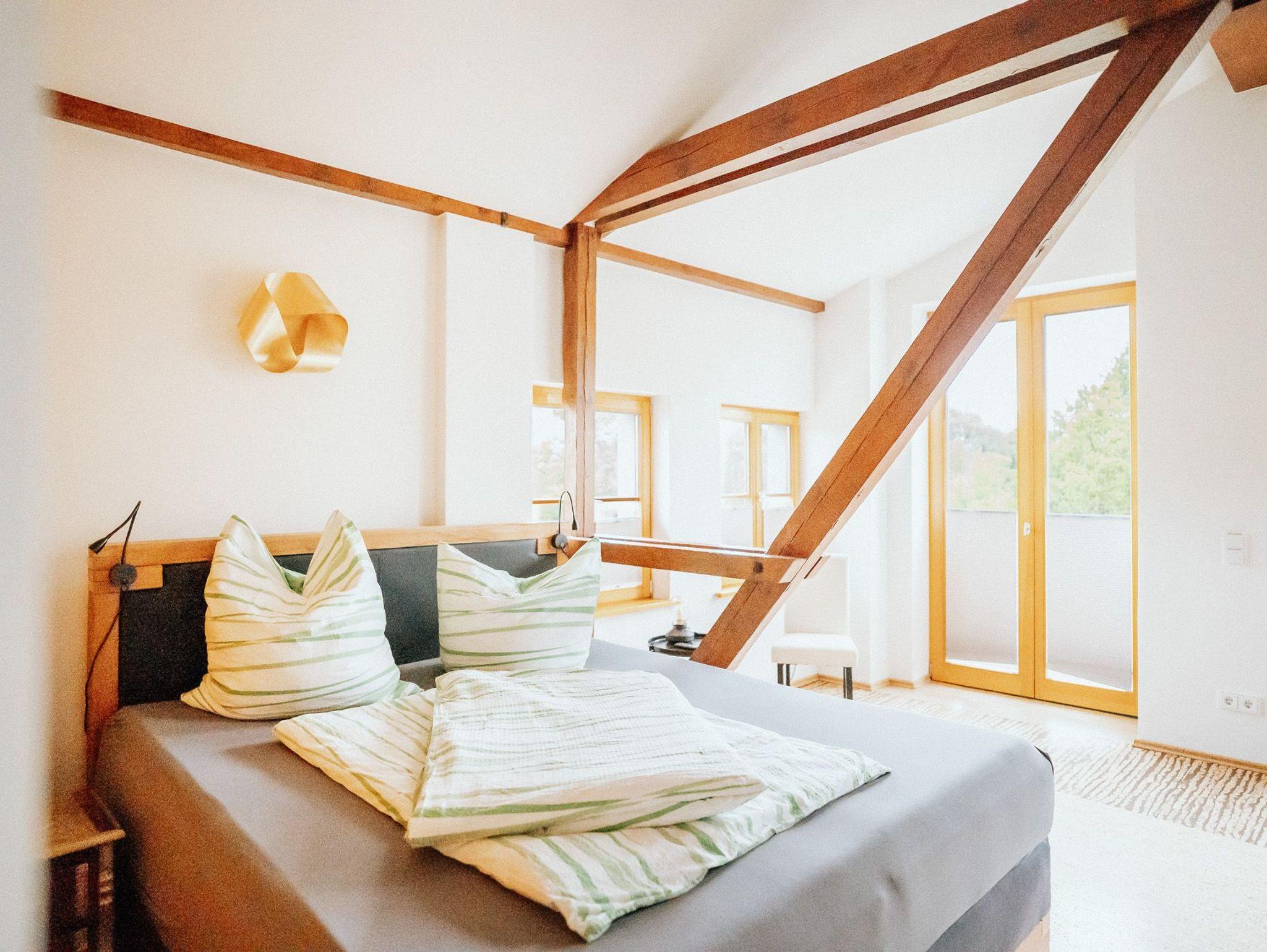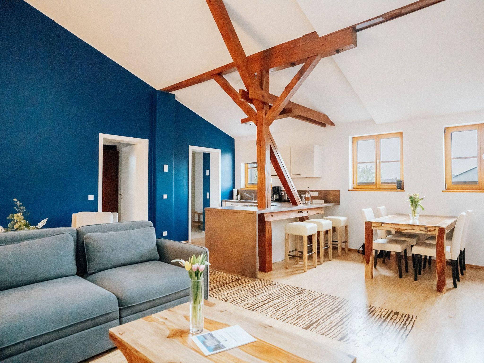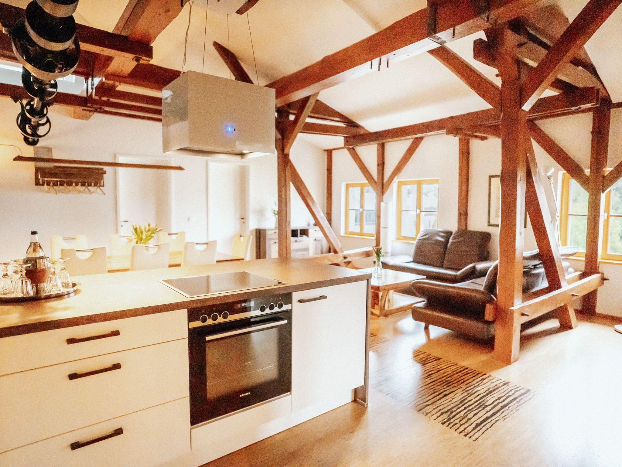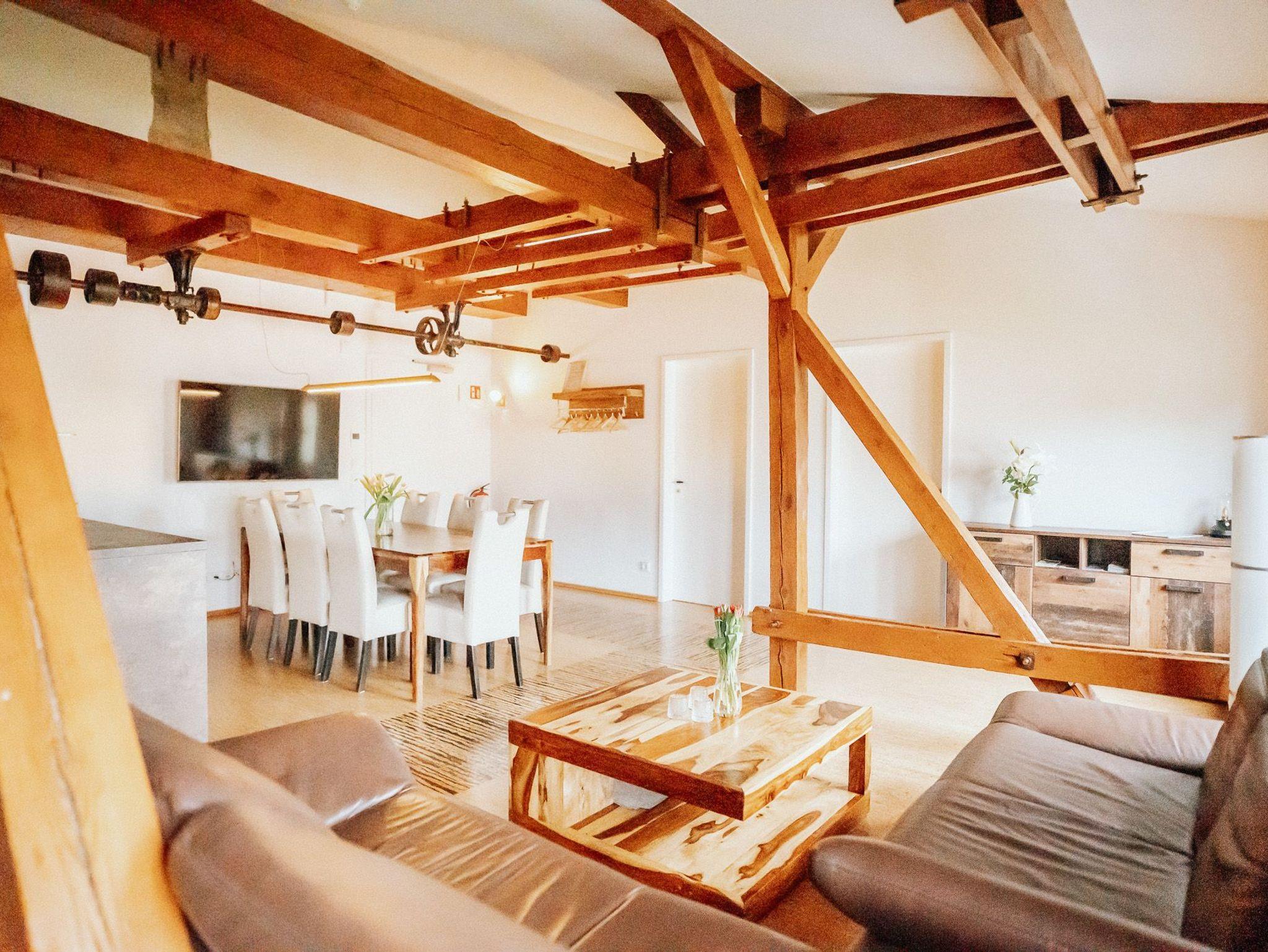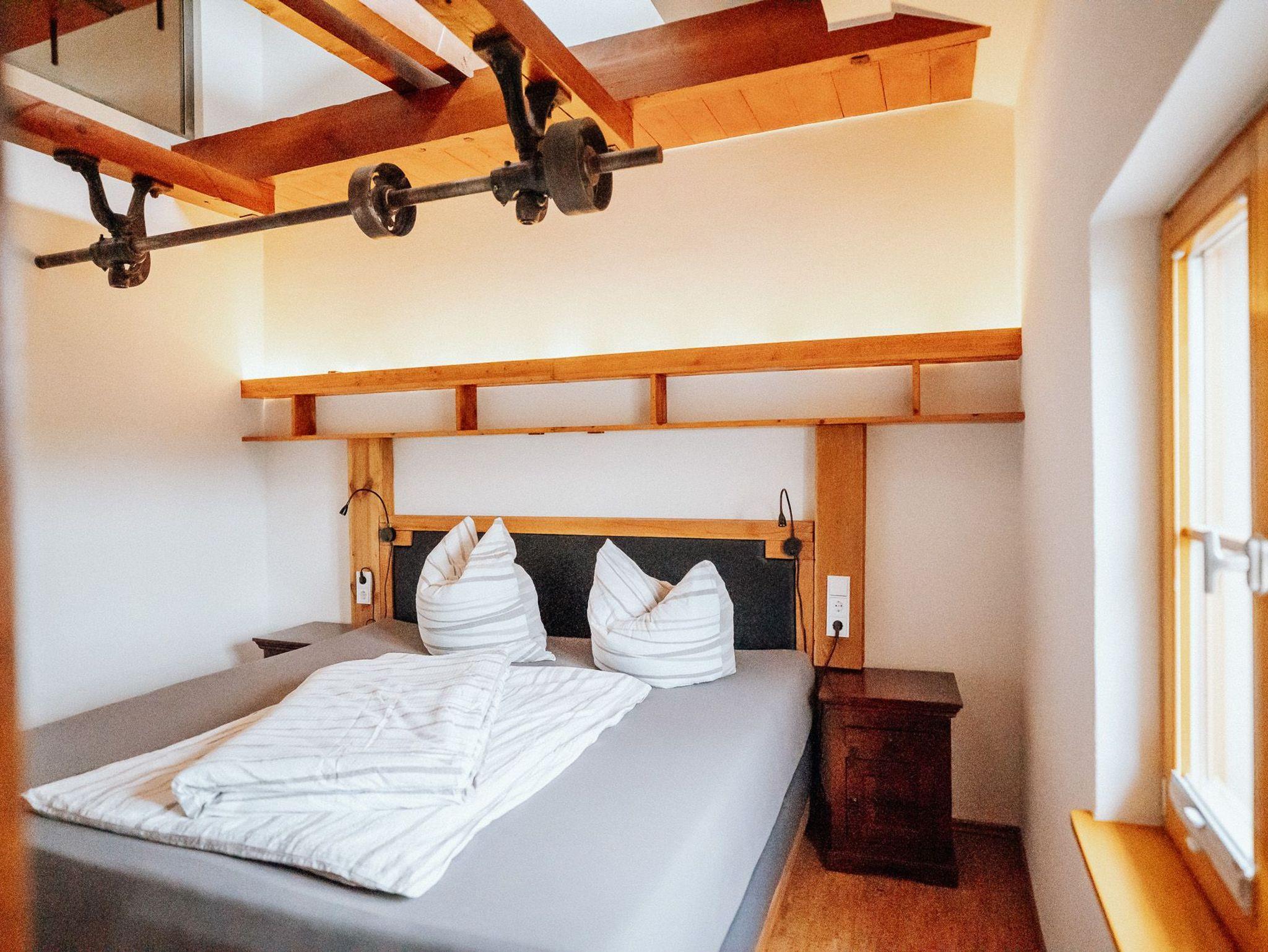 Mit 3 Schlafräumen kann die Ferienwohnung Mühlengeist bis zu 6 Personen beherbergen. In allen Räumen finden Sie Teile der alten Mühle mit modernen Einrichtungselementen verbaut.