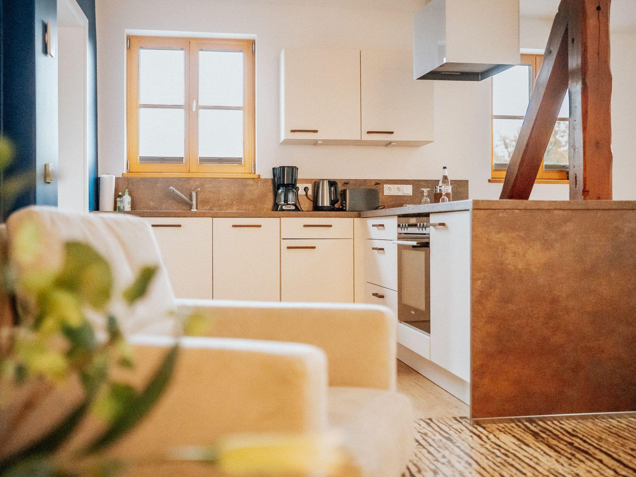 Eine voll ausgestattete Küche, ein modernes Bad mit begehbarer Dusche und Badewanne sowie ein großer Wohn- Essbereich erwarten die Gäste. Der Blick aus allen Fenstern und dem kleinen Balkon verbindet das historische Königs Wusterhausen mit dem Schloss und die Natur mit dem Mühlenfließ.