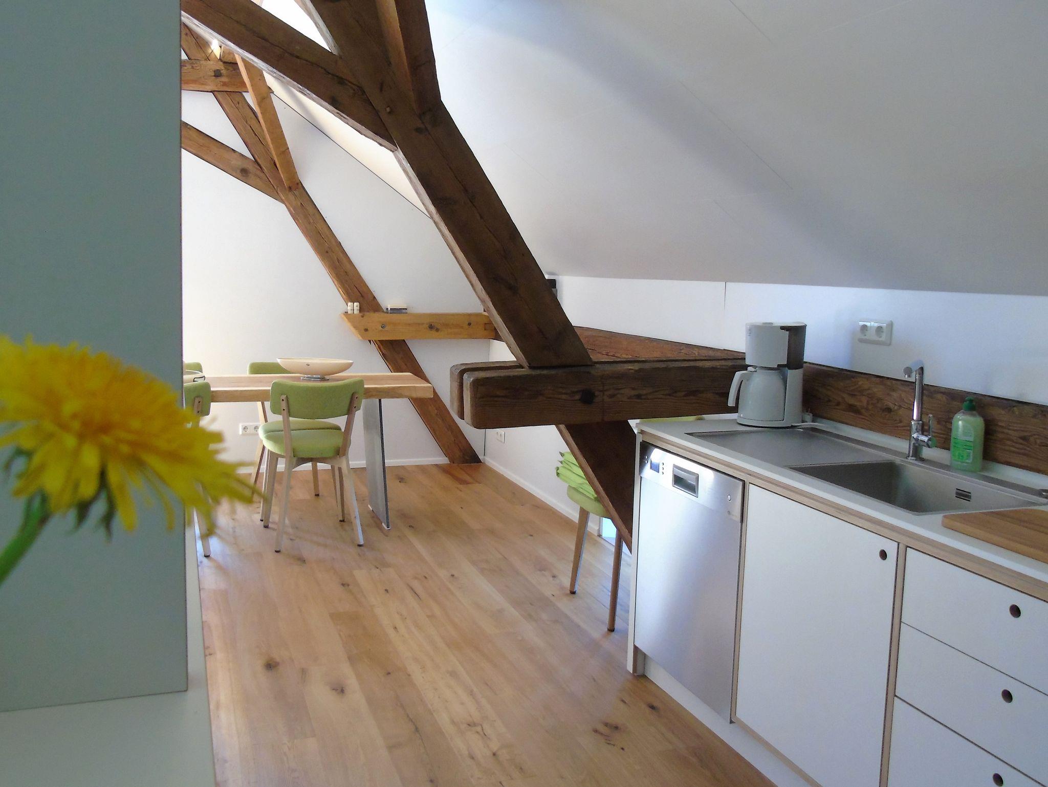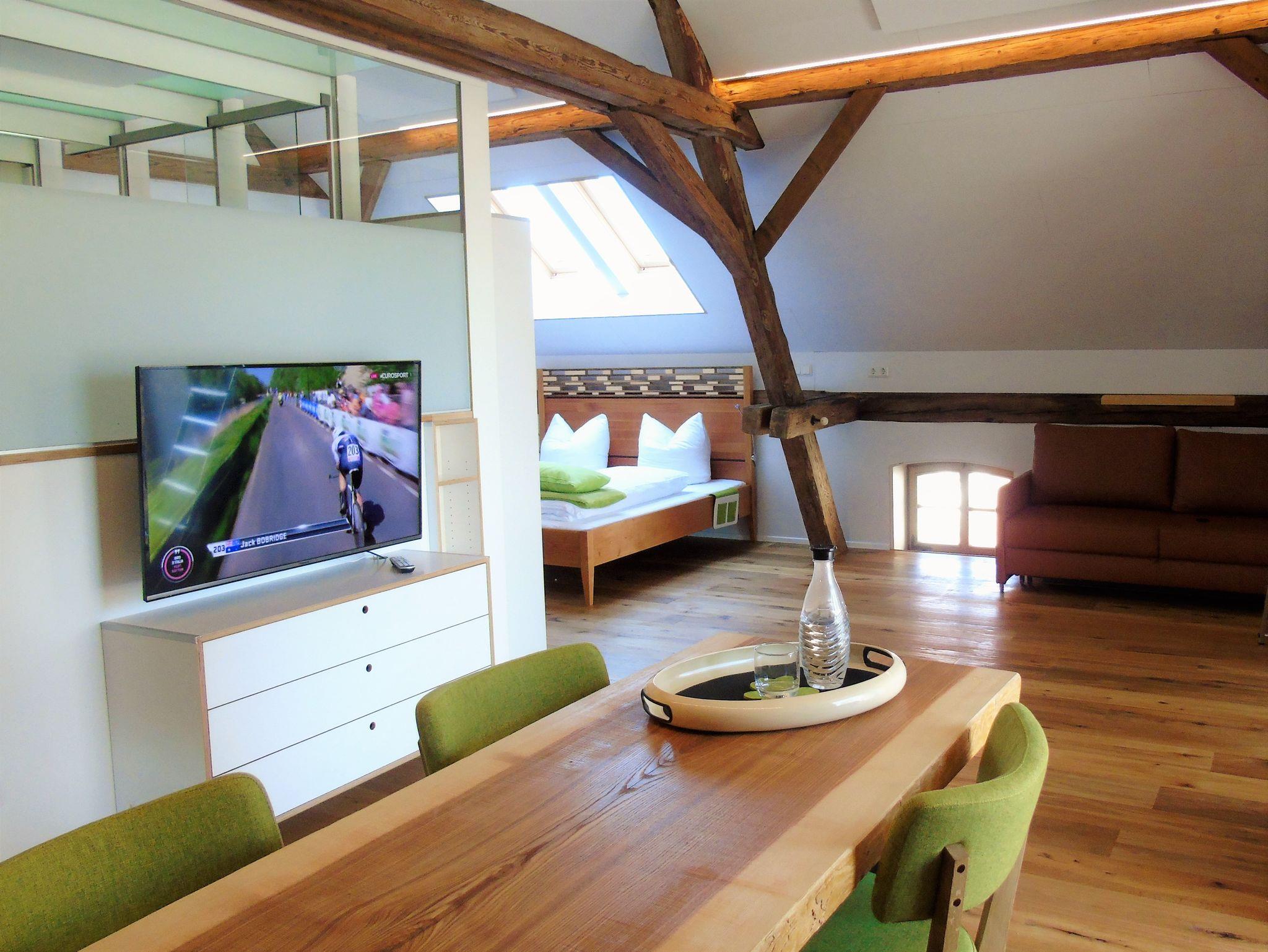 Helles Design-Apartment für 2 Gäste. 52 qm Wohnfäche und 22 qm Balkon mit der unbestritten schönsten Aussicht ins grüne Land, die das Haus zu bieten hat. Offener Schlafbereich mit Naturholz-Doppelbett Marke Eichenfrau 180x200 cm und Überlängen-Bettwäsche für besonderen Komfort. Echtleder-Schlafsofa Made in Franken in der Kuschelecke, Infrarotsauna für Zwei, großer TV-Flatscreen, moderne Küche mit vielen Extras und Eichenfrau-Essbereich mit eigens angefertigtem, besonders schönem Naturholz-Esstisch, Raum-im-Raum-Bad mit Dusche/Bidet/WC, Klimaanlage.