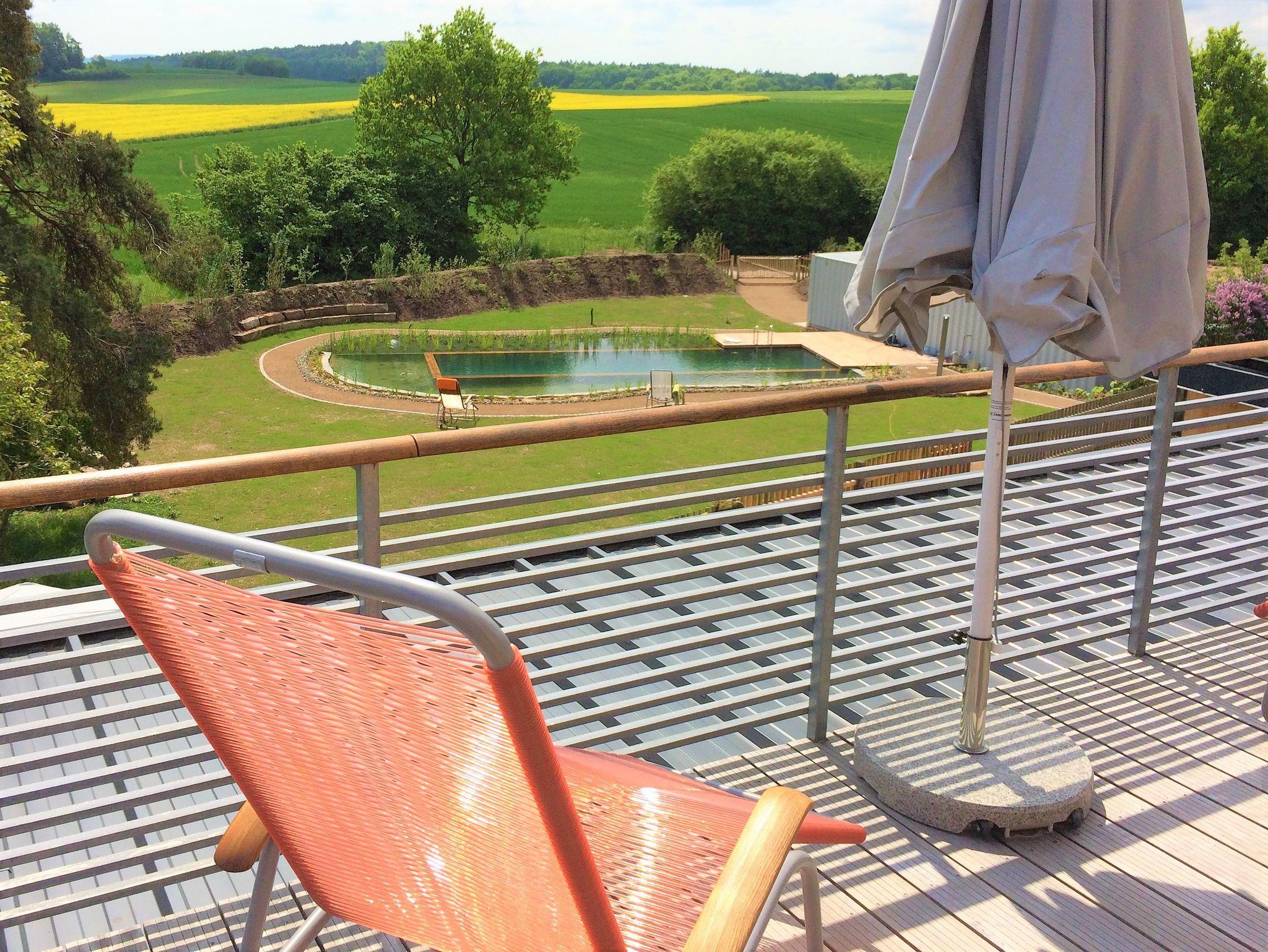 Großer Balkon zum Sonnenaufgang und mit weitem Blick in den Garten mit Naturteich und Sauna, in die grünen fränkischen Hügel, Wälder und Felder.