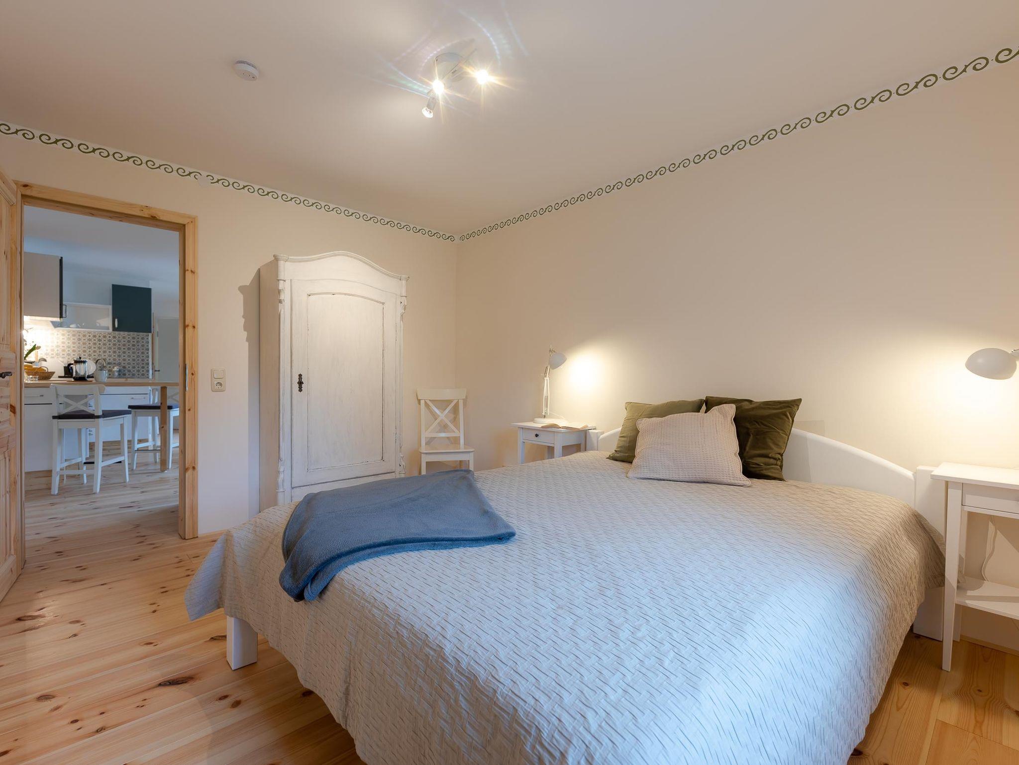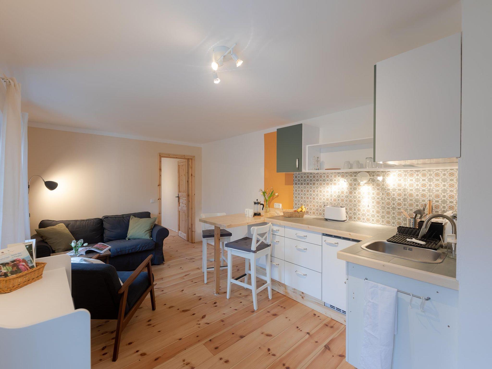 Das Spatzennest ist eine ruhige Wohnung für 2 Personen, die zur Entspannung einlädt. Die Fachwerkwände sind mit Lehm verputzt, Holz und andere natürliche Materialien sorgen für ein angenehmes Raumklima und eine gemütliche Atmosphäre.