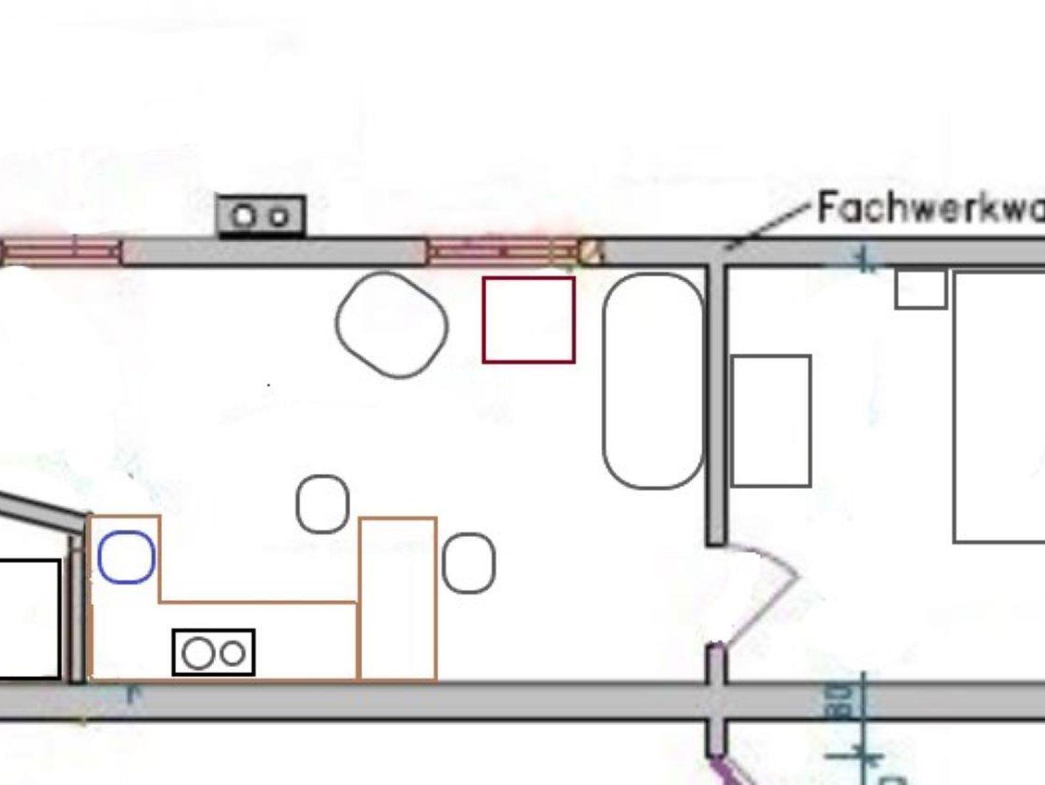Die Ferienwohnung Spatzennest verfügt auf 33 m² im ersten Stock des sanierten Seitengebäudes der Buschmühle über ein Schlafzimmer mit Doppelbett und einen Wohnbereich mit integrierter Küche und einem kleinen Bad mit Dusche/WC. Die Küche ist mit einem 2-Platten-Induktionsherd, Kühlschrank mit Gefrierfach und Toaster ausgestattet.