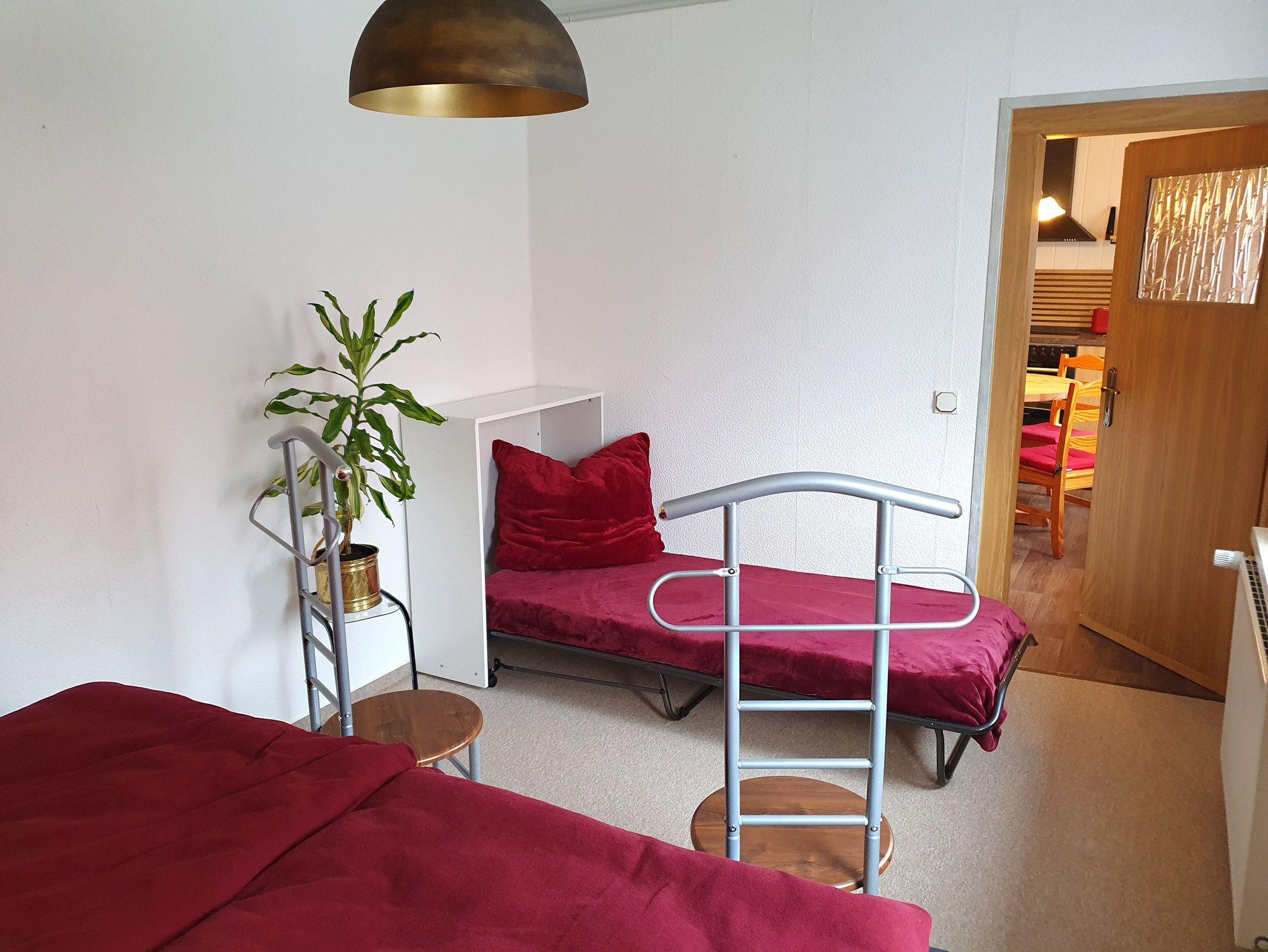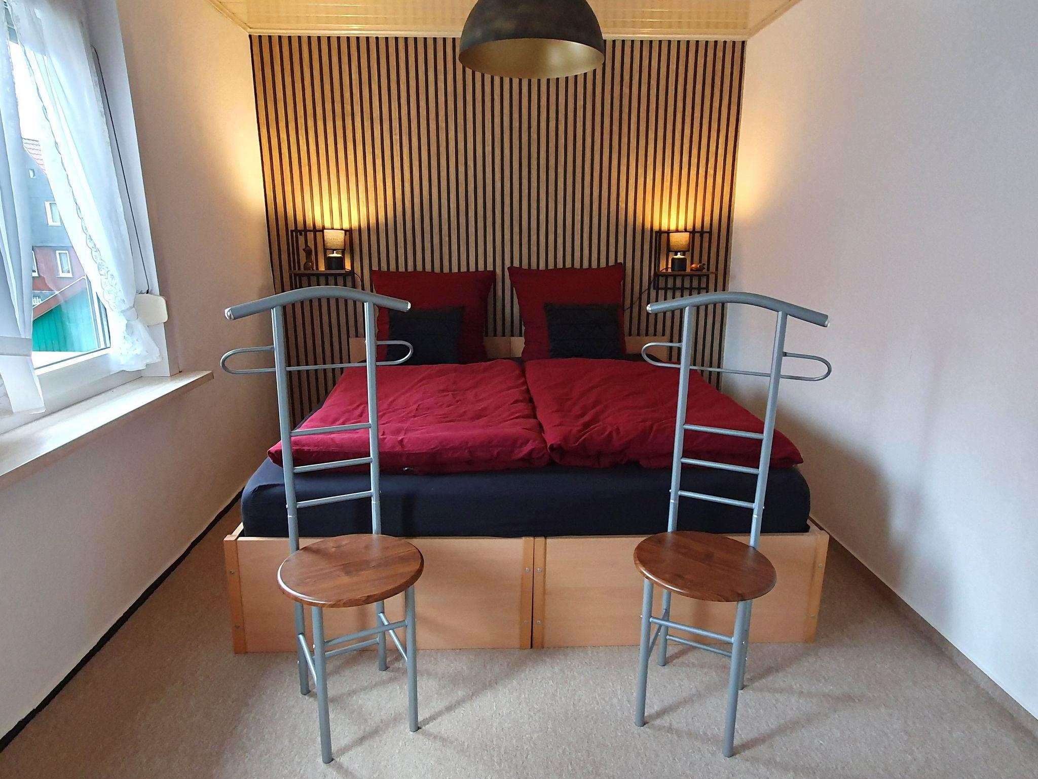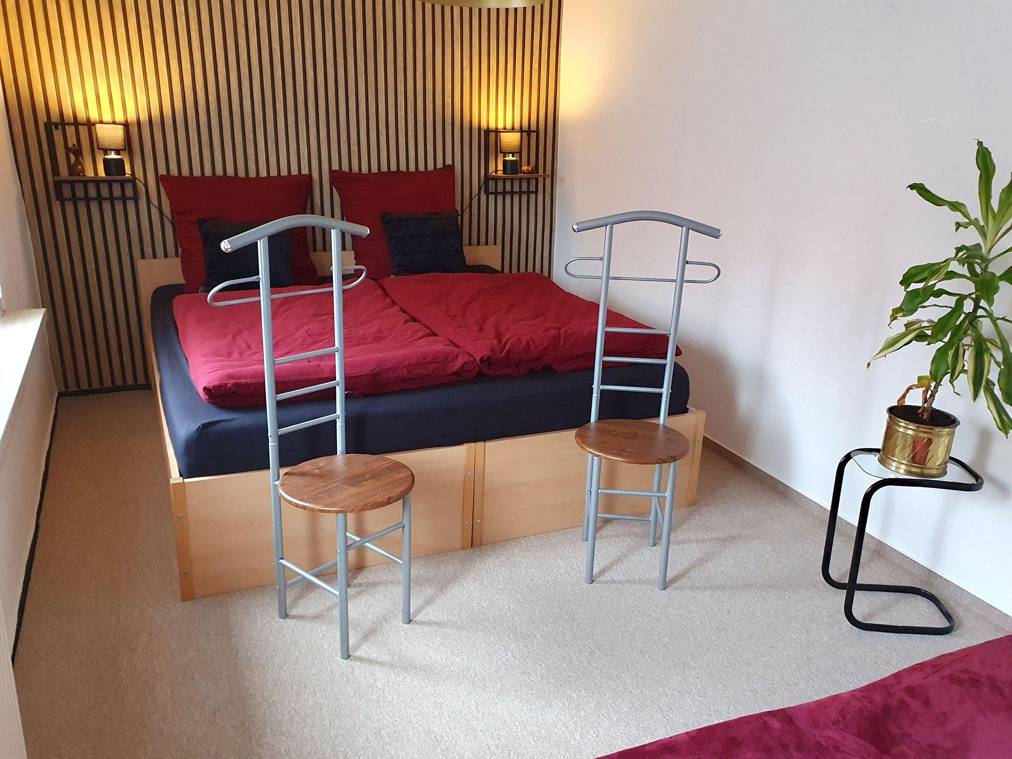Im Schlafzimmer befindet sich ein Doppelbett (1,80 x 2,00 m) mit Fußende, zwei „Kleiderstühle“ und eine Kommode. Eine zusätzliche Baby-Aufbettung wäre auf Anfrage möglich.