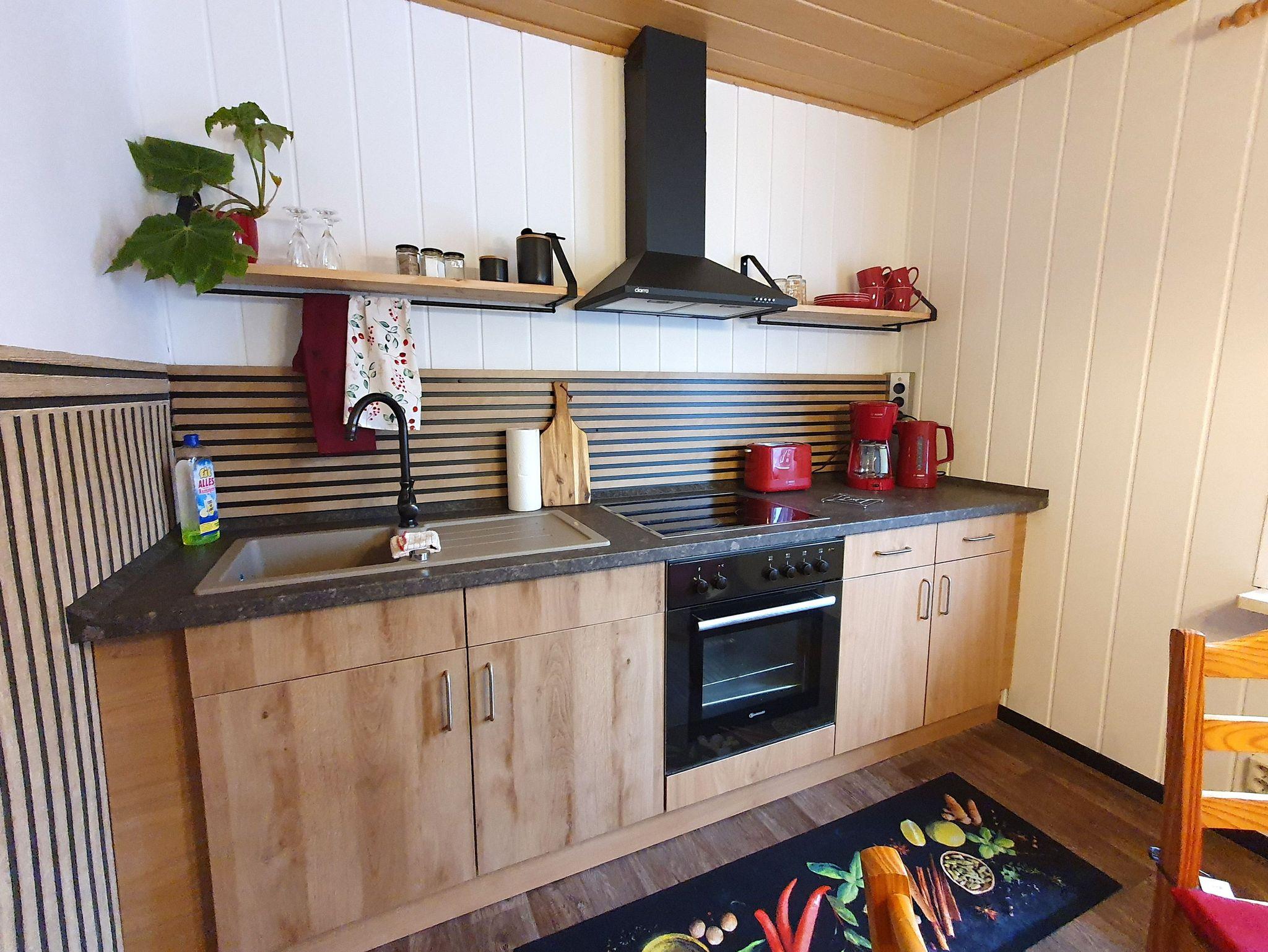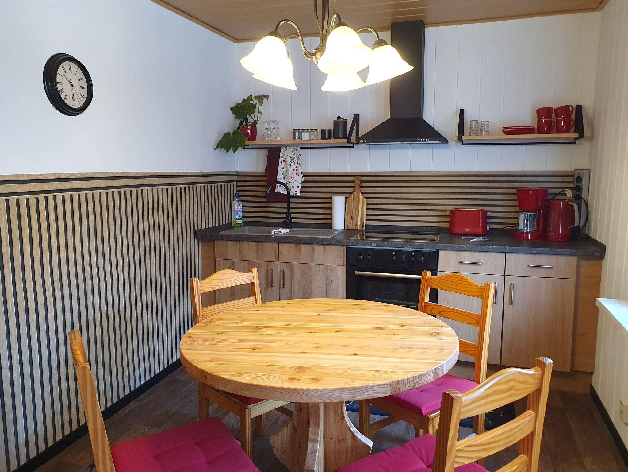 Zur Ausstattung gehören eine vollausgestattete Küche mit einem runden Tisch und vier Stühlen, einer Küchenzeile mit Ceranfeld und Backofen, einem Wohnzimmer sowie einem Schlafzimmer.