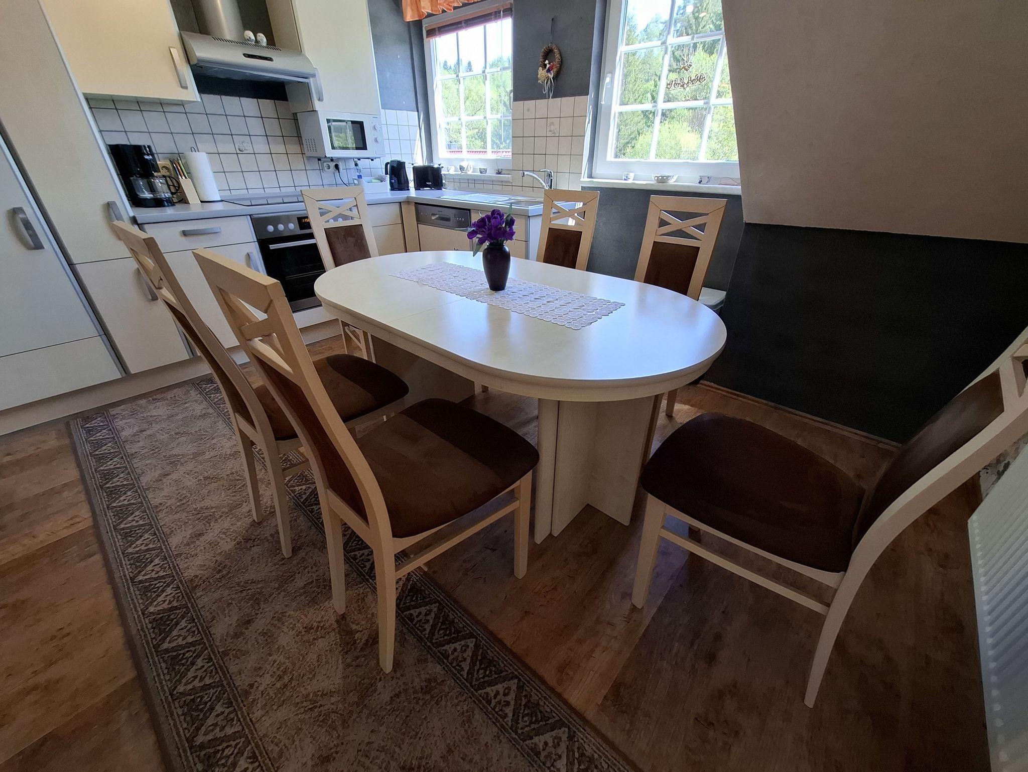 Sie verfügt über einen separaten Eingang und bietet Platz für bis zu 5 Personen. Es warten ein Wohnzimmer, eine große Wohnküche und zwei Schlafzimmer auf Sie. In dem 1. Schlafzimmer befindet sich ein Doppelbett und ein weiteres Einzelbett und im 2. Schlafzimmer zwei Einzelbetten. Die gemütliche Küche ist mit Backofen, Kühlschrank mit Gefriermöglichkeit, Mikrowelle u.v.m. ausgestattet. Ein ovaler Esstisch lädt zum Beisammensein ein. Das neue Bad verfügt über eine großzügige Dusche. Handtücher und Bettwäsche sind im Reisepreis enthalten. Der Garten mit Grillplatz steht unseren Gästen zur Verfügung. Parkplätze sind vorhanden. In dieser Ferienwohnung ist die Mitnahme eines Tieres nicht gestattet.