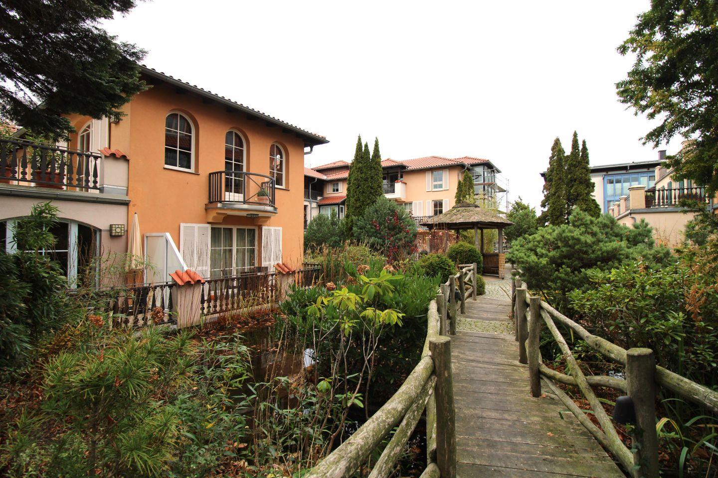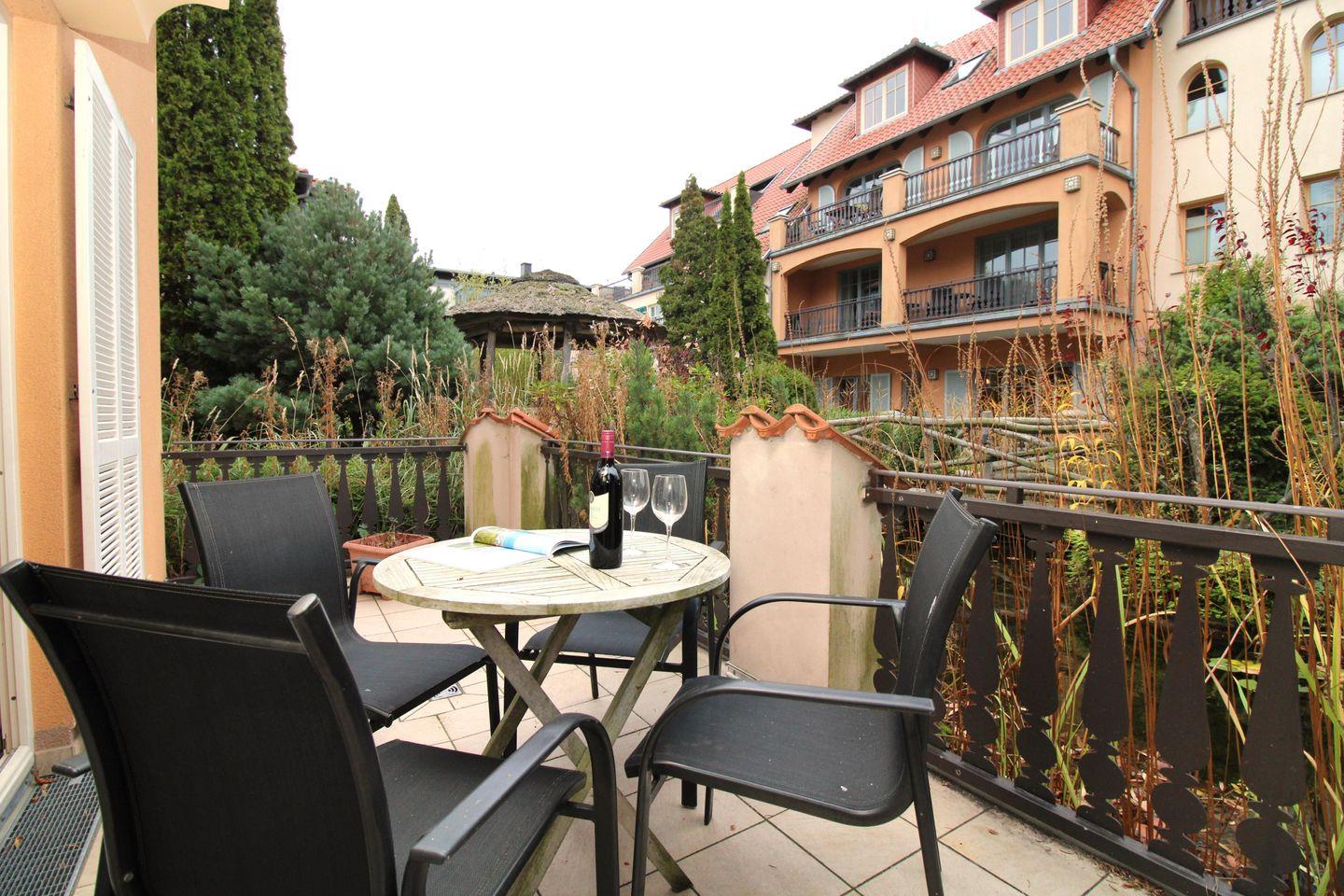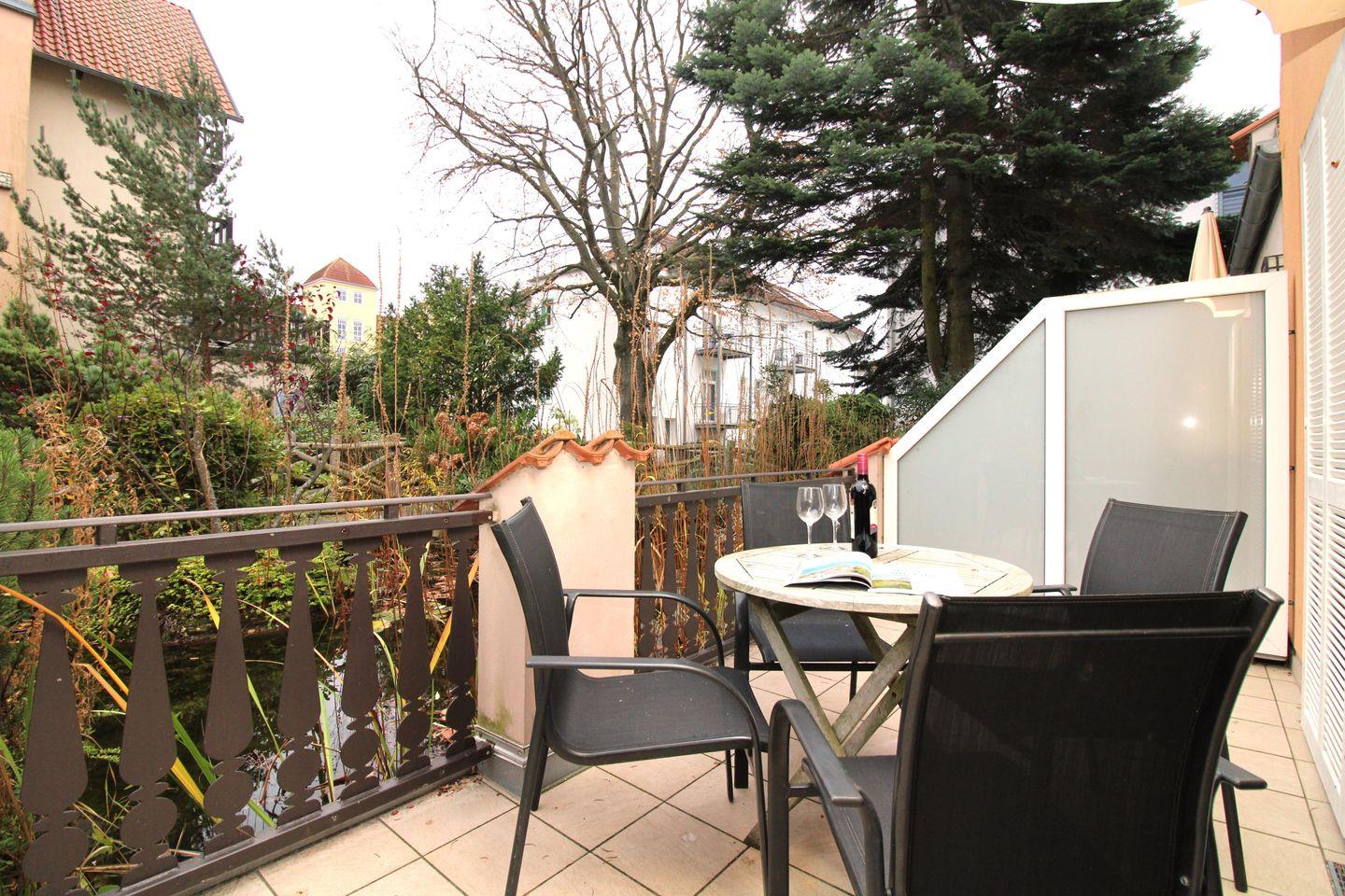 Das freundliche und großzügige Wohn-/Esszimmer verfügt über eine separate Sitzgruppe mit bequemer (Schlaf-)Couch, Sessel, Hocker und Couchtisch, einen separaten Esstisch mit 4 Stühlen sowie ein Sideboard. Vom Wohnzimmer aus haben Sie direkten Zugang zu der inmitten der wundervollen Wasser-Gartenlandschaft gelegenen ca. 10 m² großen und sonnigen Balkon-Terrasse (nach Süd-Osten ausgerichtet) mit Terrassenmöbeln. Hier sitzen Sie entspannt und gemütlich im Grünen und können abends bei einem guten Glas Wein in Ruhe die lauen Sommernächte genießen!