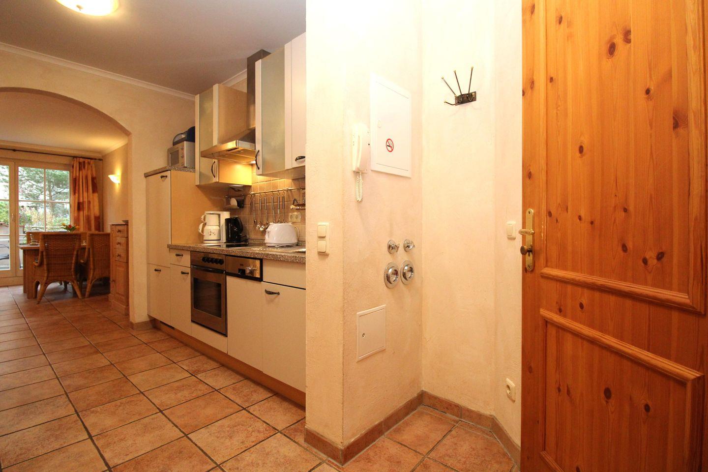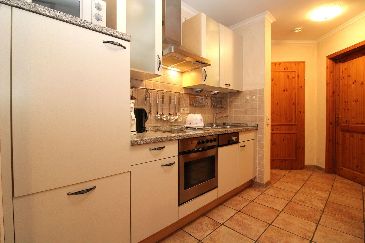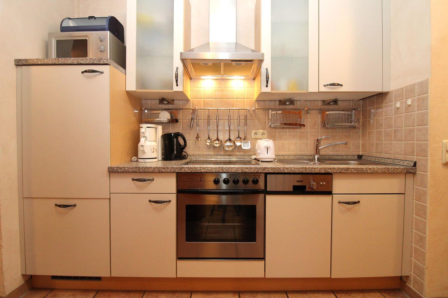 Die offene Küche beinhaltet eine voll ausgestattete Einbauküchenzeile mit 4-Platten-Ceran-Kochfeld, Backofen, Dunstabzug, Mikrowelle, Geschirrspülmaschine, Kühlschrank mit Gefrierfach, Kaffeemaschine, Wasserkocher und Toaster. Die Küche ist mit Geschirr, Gläsern, Besteck und Töpfen komplett ausgestattet.