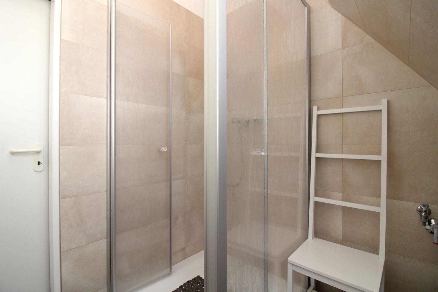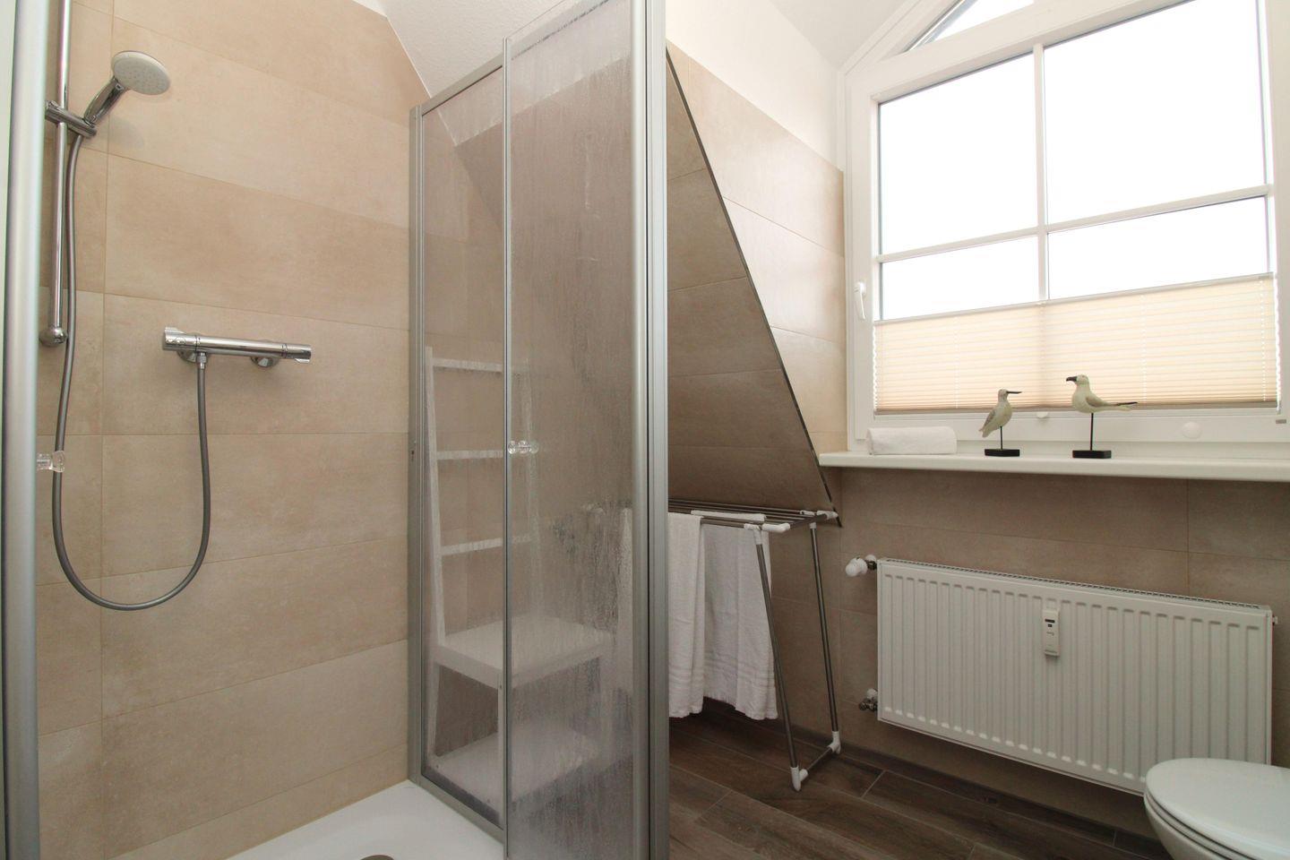 Das moderne Badezimmer (mit Tageslicht / Fenster) verfügt über eine Dusche mit bodengleichem Einstieg (seniorenfreundlich!), Waschbecken mit Unterschrank, Einbau-Radio, einen Badezimmerstuhl sowie WC.