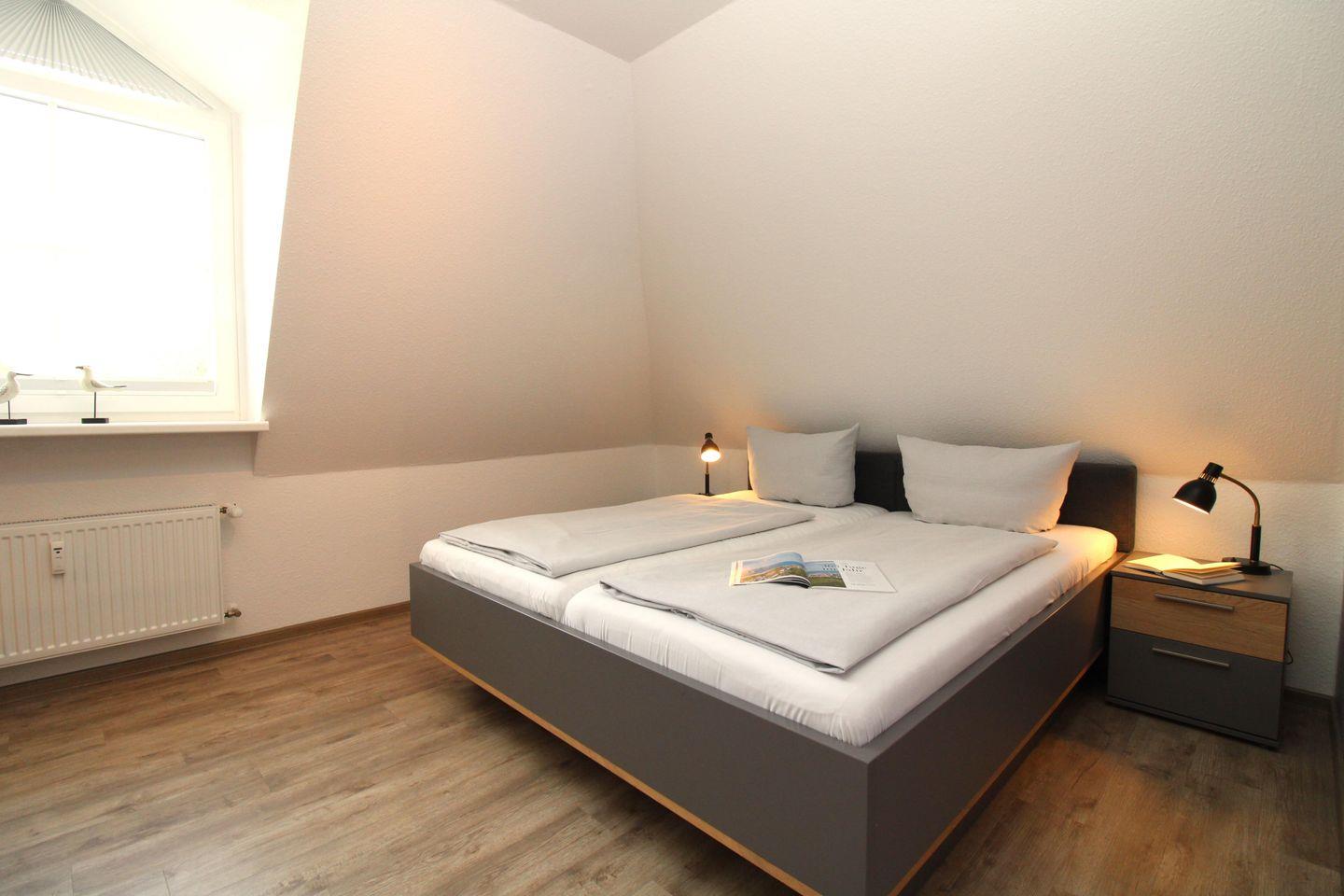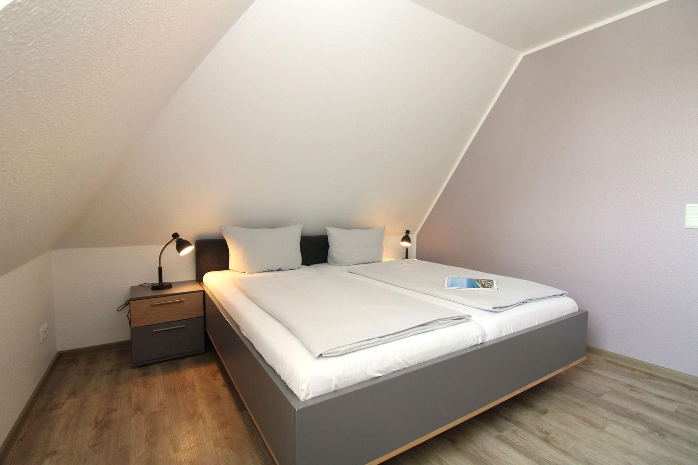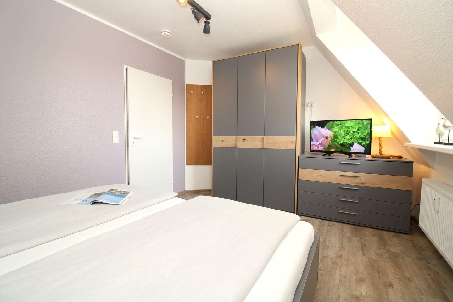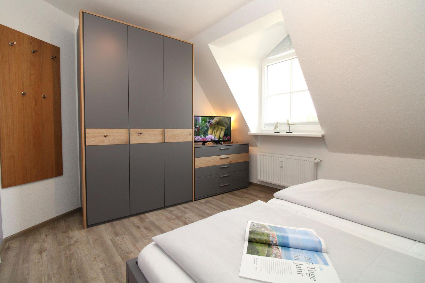 Das freundliche Schlafzimmer ist mit einem bequemen Doppelbett (2 x 90 x 200 cm), 2 Nachttischen, einer Kommode sowie einem geräumigen Kleiderschrank eingerichtet.
