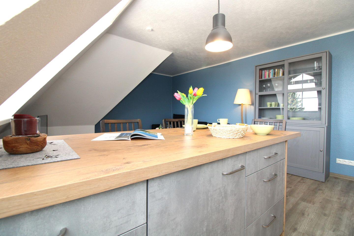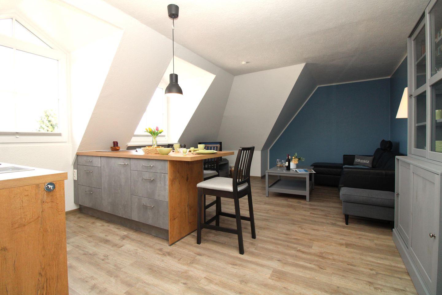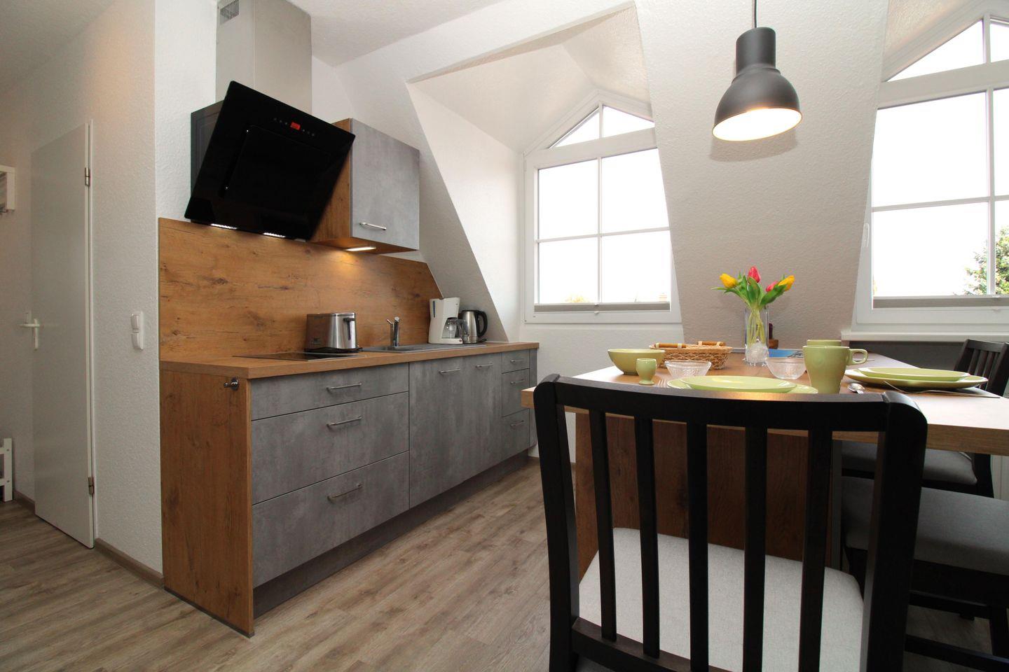 Die offene Küche beinhaltet eine voll ausgestattete Einbauküchenzeile mit 2-Zonen-Induktions-Kochfeld, Mikrowelle, Dunstabzug, Geschirrspülmaschine, Kühlschrank mit Gefrierfach, Kaffeemaschine, Wasserkocher und Toaster. Die Küche ist mit Geschirr, Gläsern, Besteck und Töpfen bestens und vollständig ausgestattet.