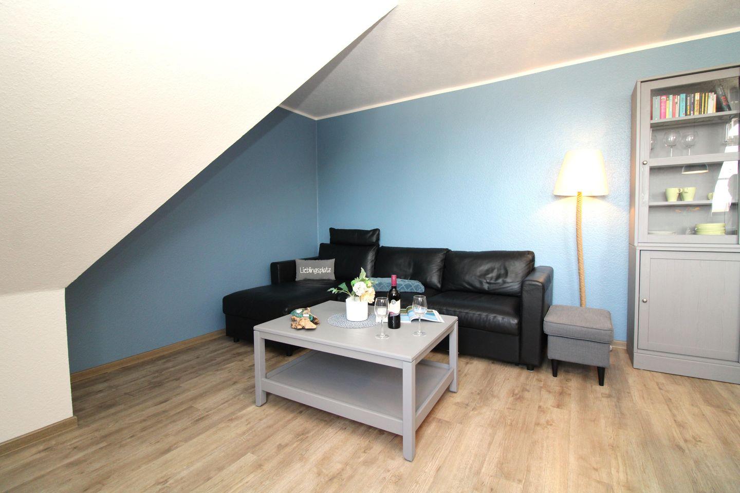 Eine zusätzliche bequeme Schlafmöglichkeit für eine weitere 3. Person bietet die klappbare Schlafcouch im Wohnzimmer.
