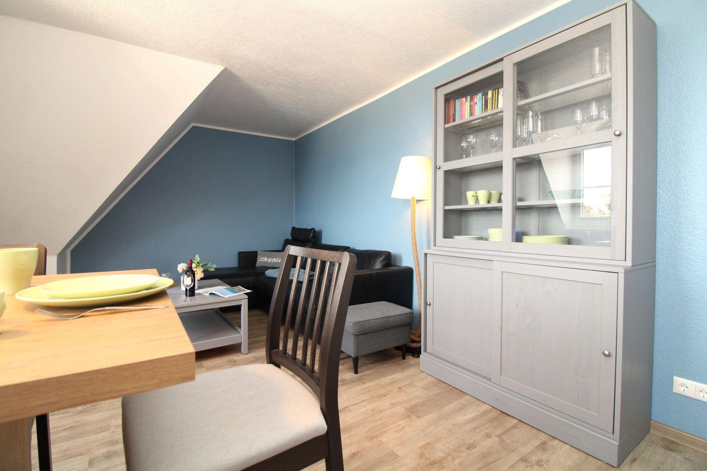 Das geräumige und modern eingerichtete Wohn-/Esszimmer verfügt über eine separate Sitzgruppe mit bequemer (klappbarer) Eck-Ledercouch, einem Hocker und Couchtisch, einen separaten Essbereich mit 3 Stühlen, ein Sideboard sowie einen Wohnzimmerschrank.