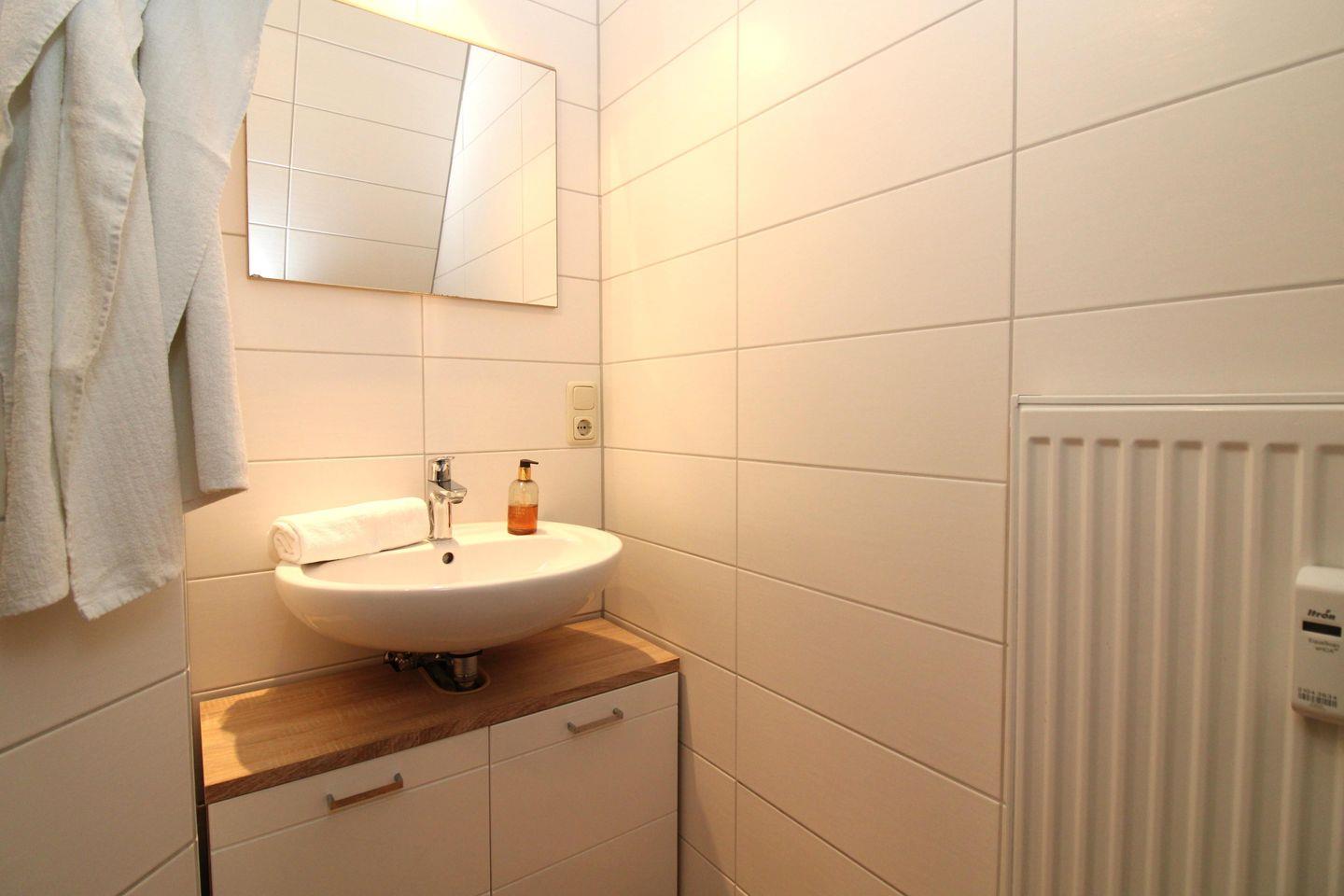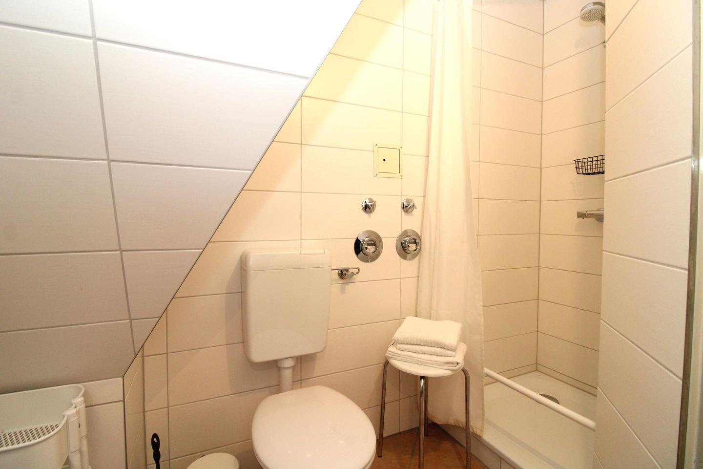 Das Badezimmer verfügt über eine Dusche, Waschbecken mit Unterschrank, WC sowie ausreichend Ablagemöglichkeiten.