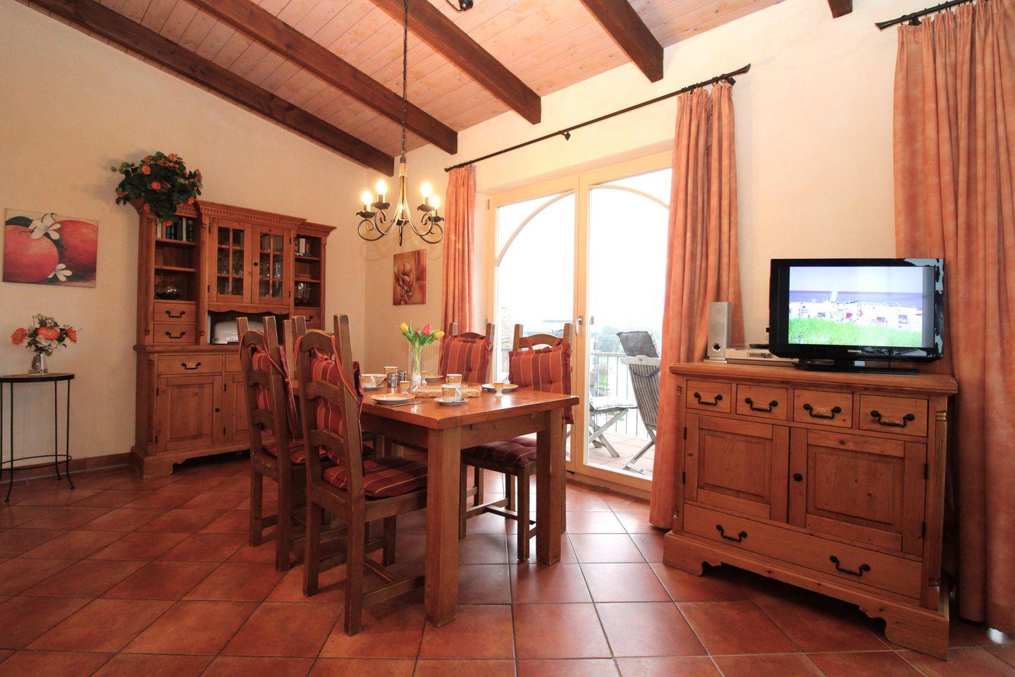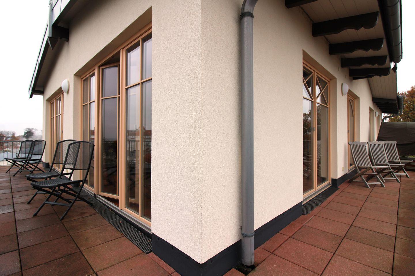 Das sehr geräumige und helle Wohn-/Esszimmer (im DG) verfügt über eine separate Sitzgruppe mit bequemer (Schlaf-)Couch, 2 Sessel, Hocker und Couchtisch, einen separaten Esstisch mit 6 Stühlen, einen Geschirrschrank sowie ein Sideboard. Durch die bodentiefen Fenster bzw. Terrassentüren dieses Raumes haben Sie überall direkten Zugang zu der herrlichen, ca. 33 m² großen und sonnigen Dachterrasse (nach Süden, Westen und Norden ausgerichtet) mit Balkonmöbeln. Hier sitzen Sie entspannt und gemütlich hoch über den Dächern und können abends bei einem guten Glas Wein in Ruhe die lauen Sommernächte genießen!