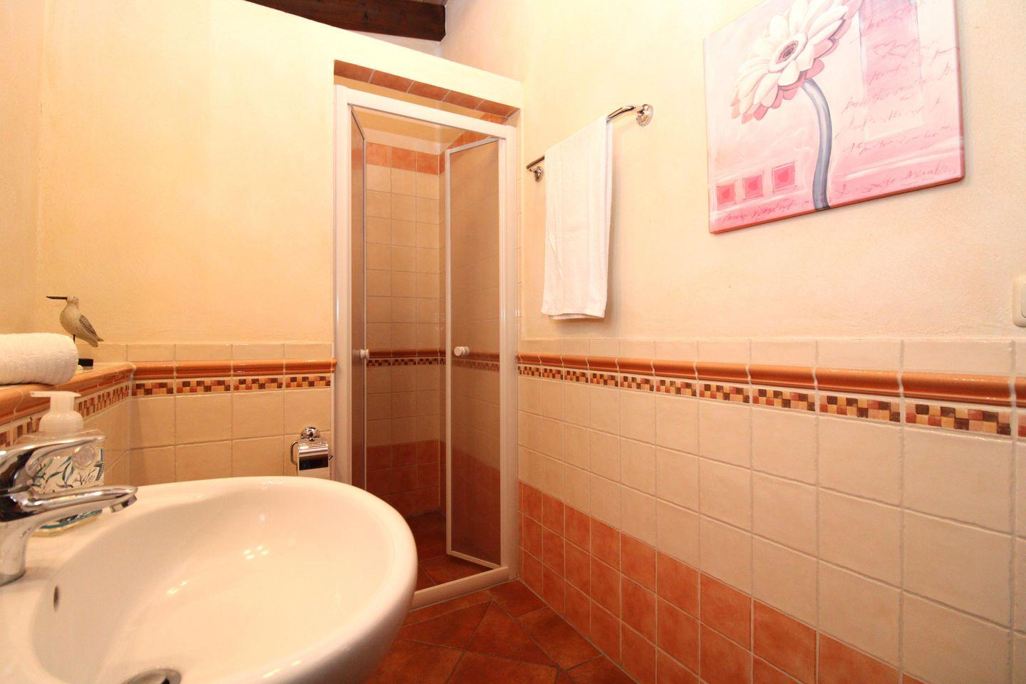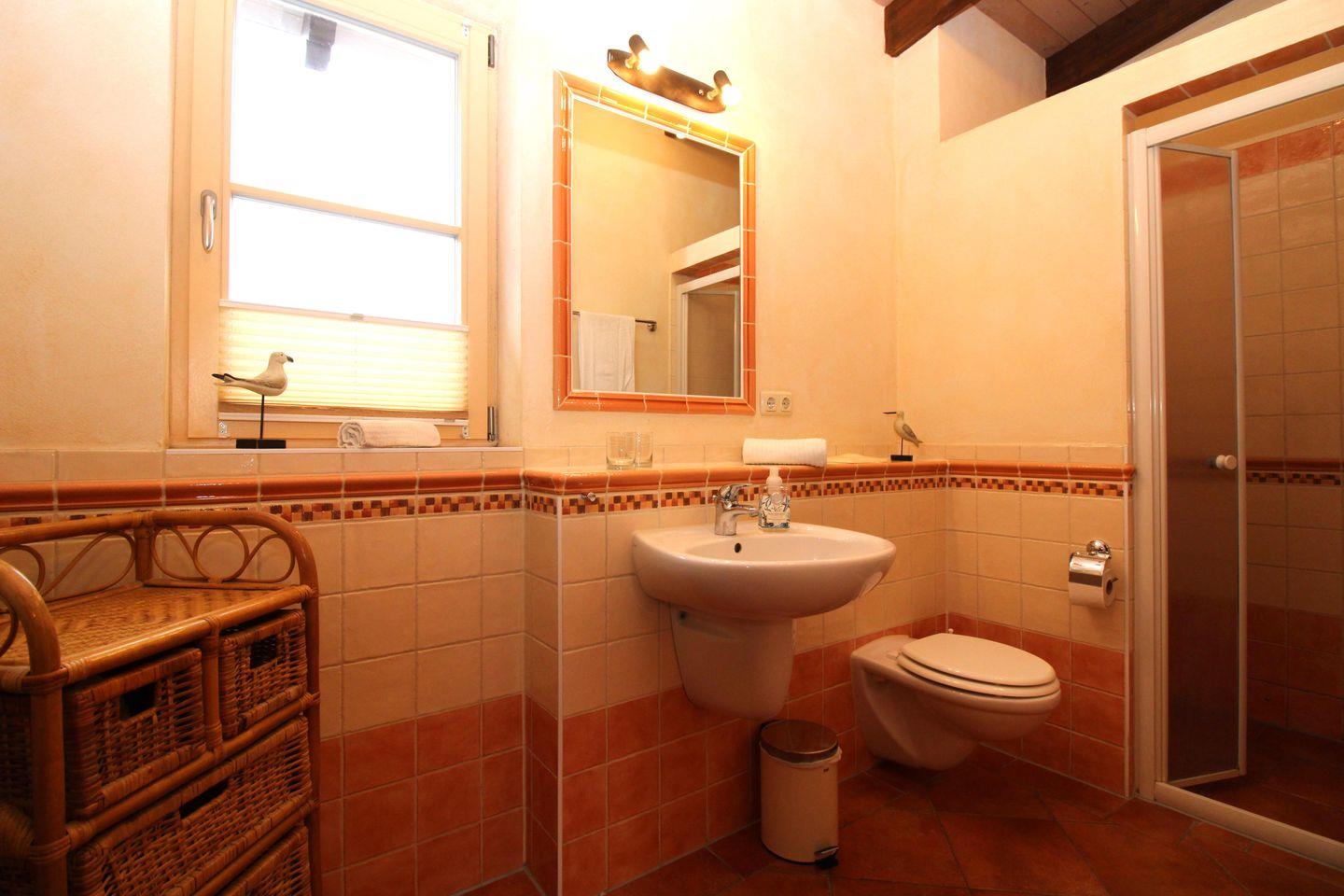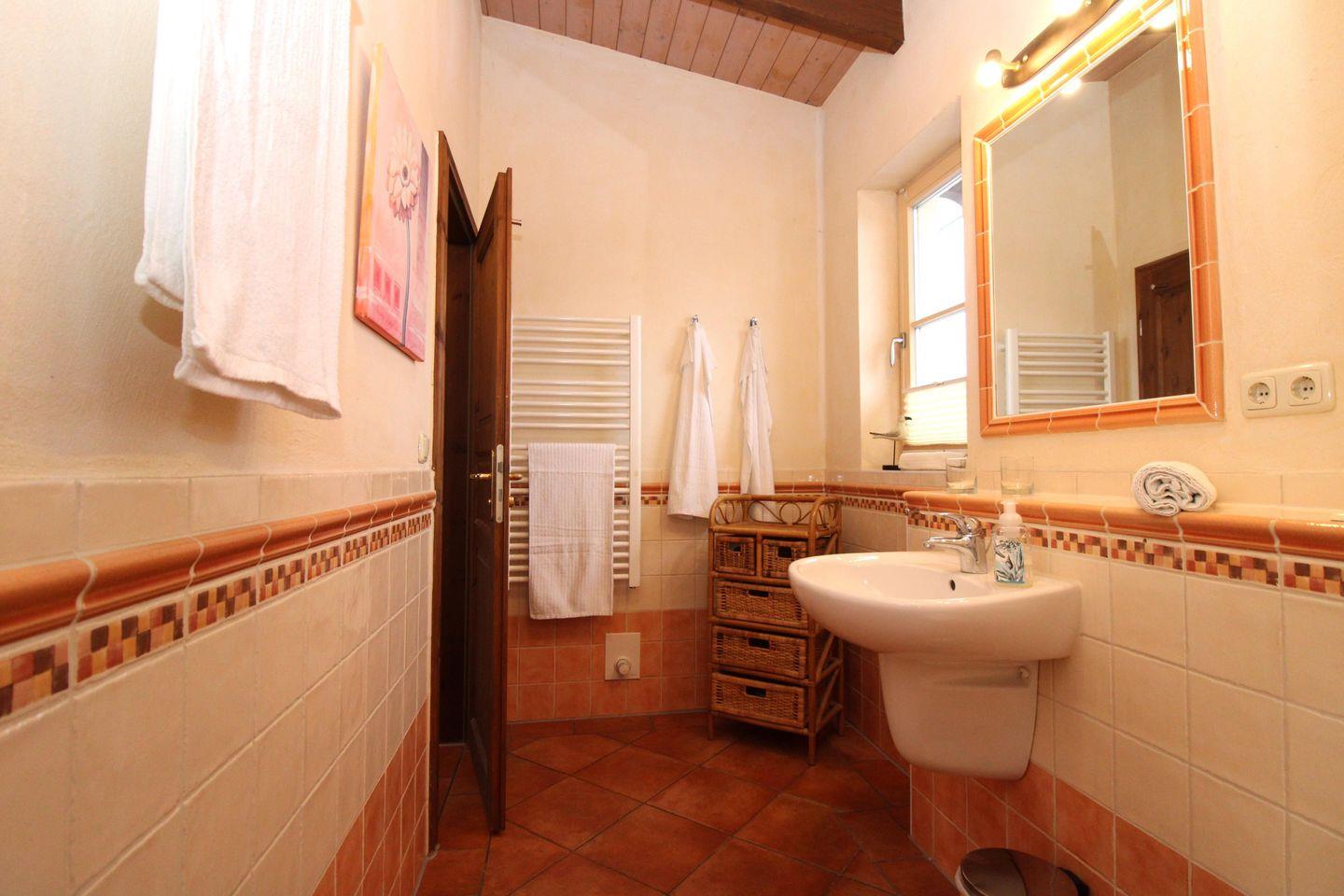 Das mediterran anmutende 1. Badezimmer (mit Tageslicht / Fenster) im DG verfügt über eine begehbare Dusche mit bodengleichem Einstieg (seniorenfreundlich!), Waschbecken und WC, Handtuch-Heizkörper, Föhn, Kosmetikspiegel sowie ausreichend Ablagemöglichkeiten.