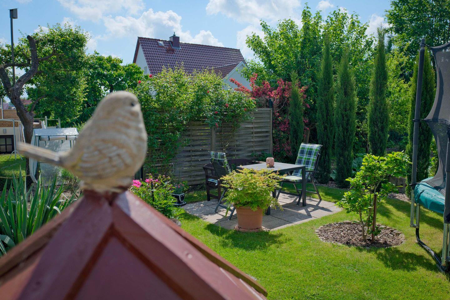 Ein Highlight ist der grüne Gartenbereich mit eigener Sitzecke, wo Sie bei einem Glas Wein die frische Ostseeluft genießen können. Für Ihr Fahrzeug steht ein Außenstellplatz bereit, und E-Bikes finden Platz in einem abschließbaren Schuppen mit Stromanschluss.