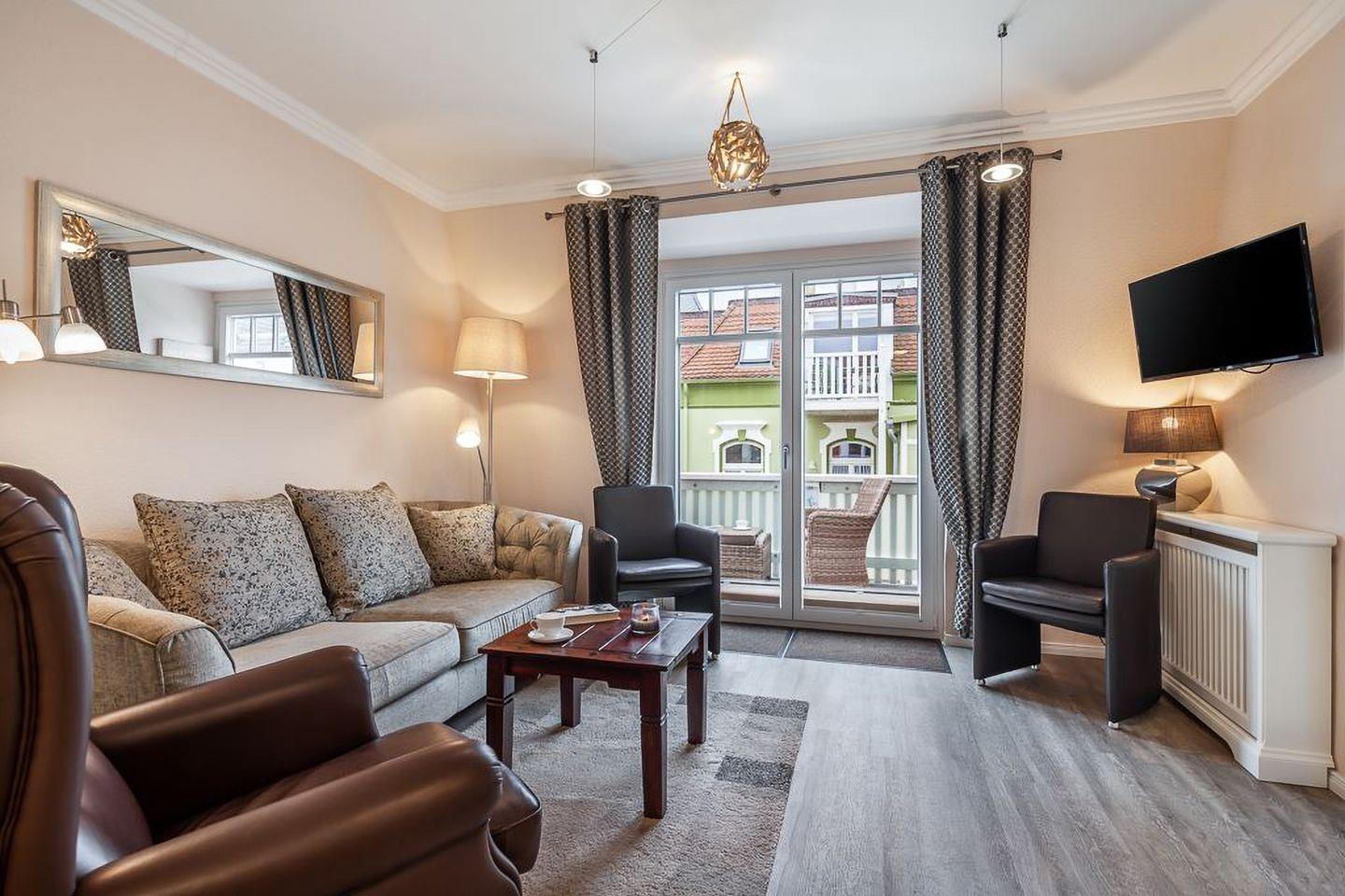 Die 68 m² große, lichtdurchflutete Wohnung bietet Platz für bis zu vier Personen. Zwei geschmackvoll eingerichtete Schlafzimmer – jedes mit eigenem Tageslichtbad – sorgen für Privatsphäre und Erholung. Der großzügige Wohnbereich lädt mit gemütlicher Sofaecke, Leselampe und großem Esstisch zu entspannten Stunden ein. Edle Materialien, harmonische Farben und stilvolle Details schaffen eine Atmosphäre von Wärme und Eleganz.