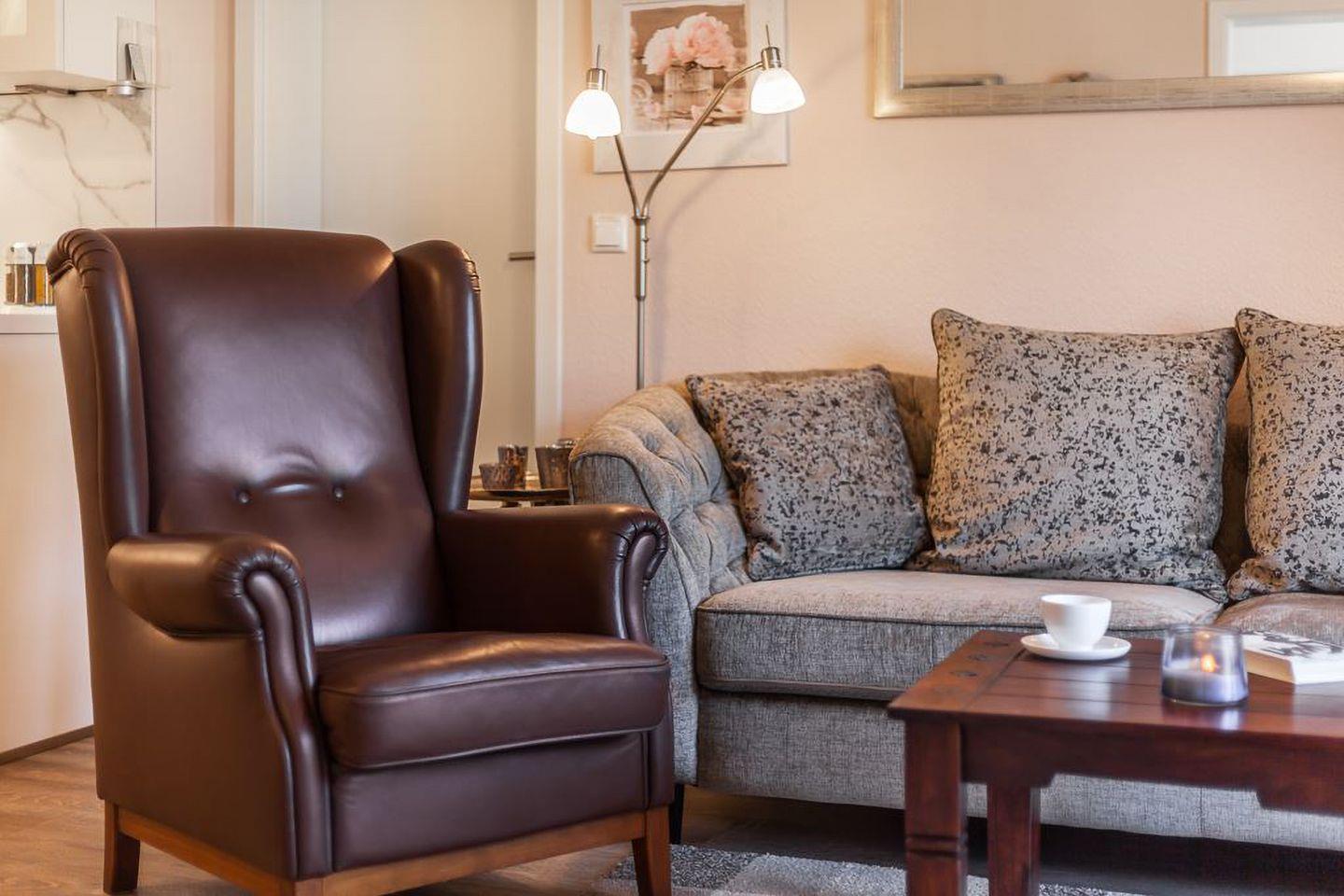 Ein besonderes Highlight ist der windgeschützte Balkon mit Strandkorb und bequemen Rattansesseln – perfekt für ein Frühstück in der Morgensonne oder ein Glas Wein am Abend. Der gepflegte Garten mit Terrasse steht allen Gästen zur Mitbenutzung offen.