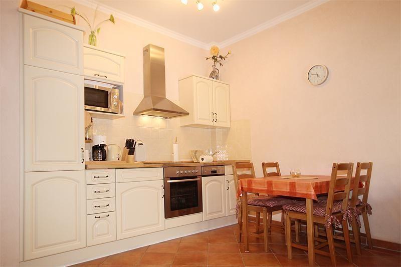Der an den Essbereich angrenzende offene Küchenbereich im Landhausstil beinhaltet eine voll ausgestattete Einbauküchenzeile in gehobener Ausstattung mit Umluftherd, 4-Zonen-Ceran-Kochfeld, Dunstabzug, Backofen, Kühlschrank mit Gefrierfach, Geschirrspülmaschine, Kaffeemaschine, Wasserkocher, Toaster und Eierkocher. Die Küche ist mit Geschirr, Gläsern, Besteck und Töpfen vollständig und bestens ausgestattet.