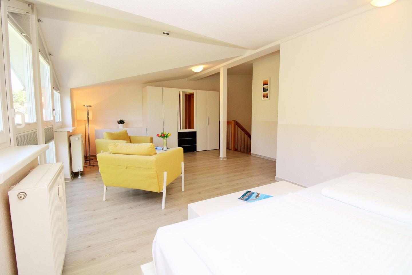 Das großzügige und helle 1. Schlafzimmer ist mit einem bequemen Doppelbett, Nachttischen, 2 geräumigen Kleiderschränken, einer Kommode sowie einem separaten Sitzbereich mit 2 bequemen Sesseln und einem Couchtisch eingerichtet. Das Zimmer besitzt 2 große bodentiefe Fenster (französischer Balkon) mit freiem Blick ins Grüne.