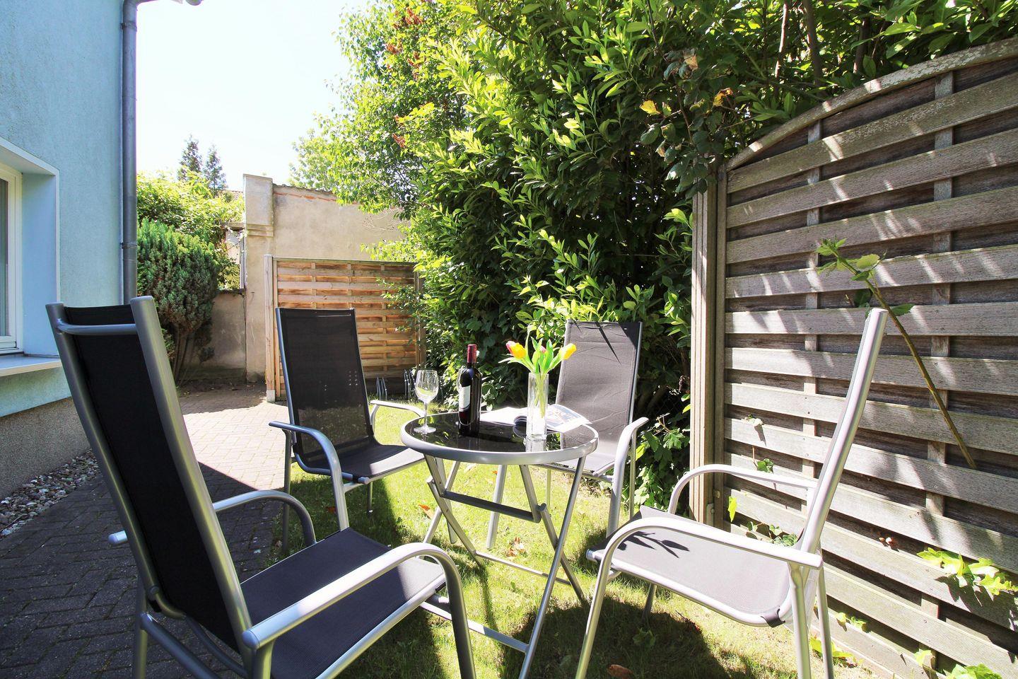 Die Wohnung verfügt direkt vor dem Eingangsbereich über einen ebenerdigen, ca. 15 m² großen Garten- bzw. Rasenbereich mit Gartenmöbeln. Hier sitzen Sie entspannt und gemütlich im Grünen und können abends bei einem guten Glas Wein in Ruhe die lauen Sommernächte genießen!