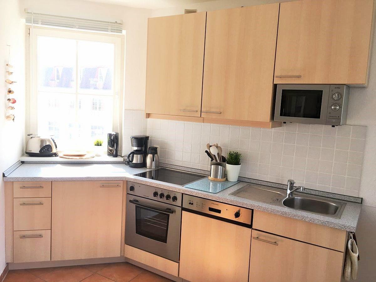 Der offene Küchenbereich beinhaltet eine voll ausgestattete Einbauküchenzeile mit 4-Platten-Ceran-Kochfeld, Backofen, Dunstabzug, Mikrowelle, Kühlschrank, Geschirr-spülmaschine, Kaffeemaschine, Wasserkocher und Toaster. Die Küche ist mit Geschirr, Gläsern, Besteck und Töpfen bestens und ausreichend ausgestattet.