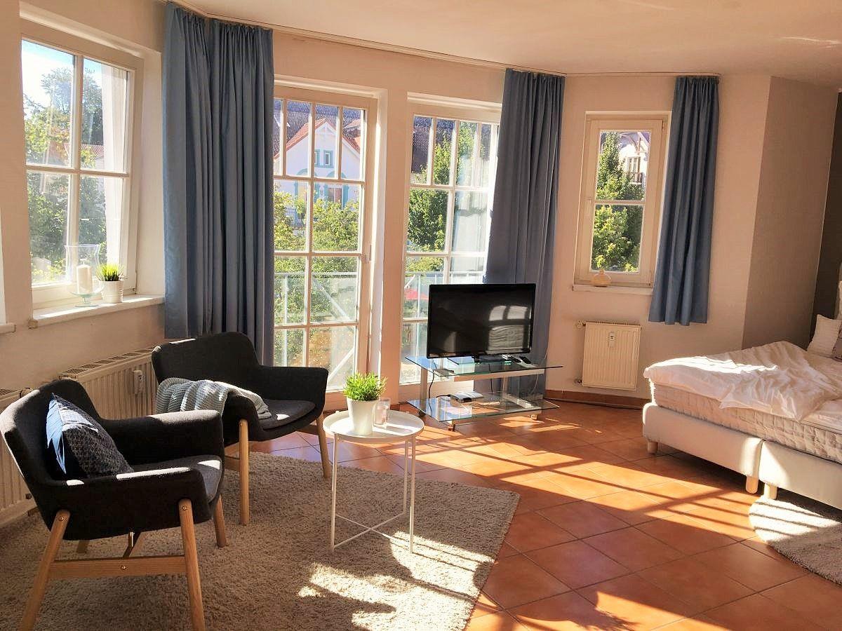Der helle und moderne Wohn-/Essbereich verfügt über 2 bequeme Sessel mit einem kleinen Couchtisch sowie einen separaten Esstisch mit 2 Stühlen. Von hier aus können Sie durch den französischen Balkon mit seinen raumhohen Fenstern den herrlichen Rundum-Blick mit dem munteren Treiben auf der Strandstraße genießen.