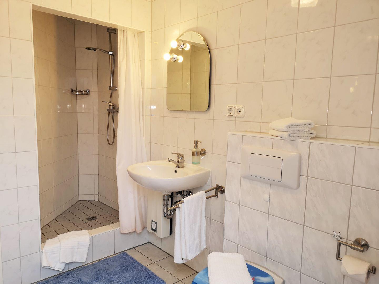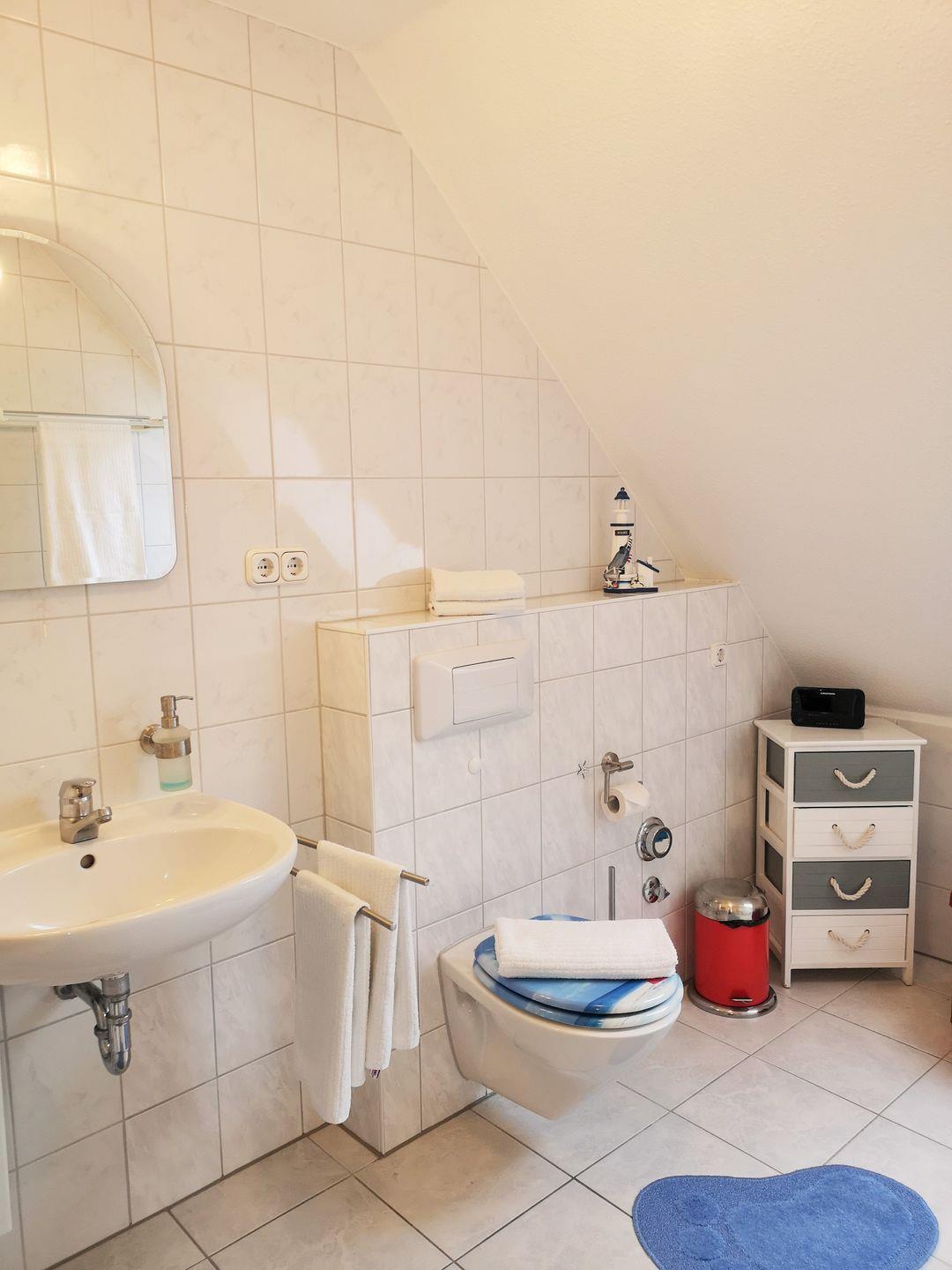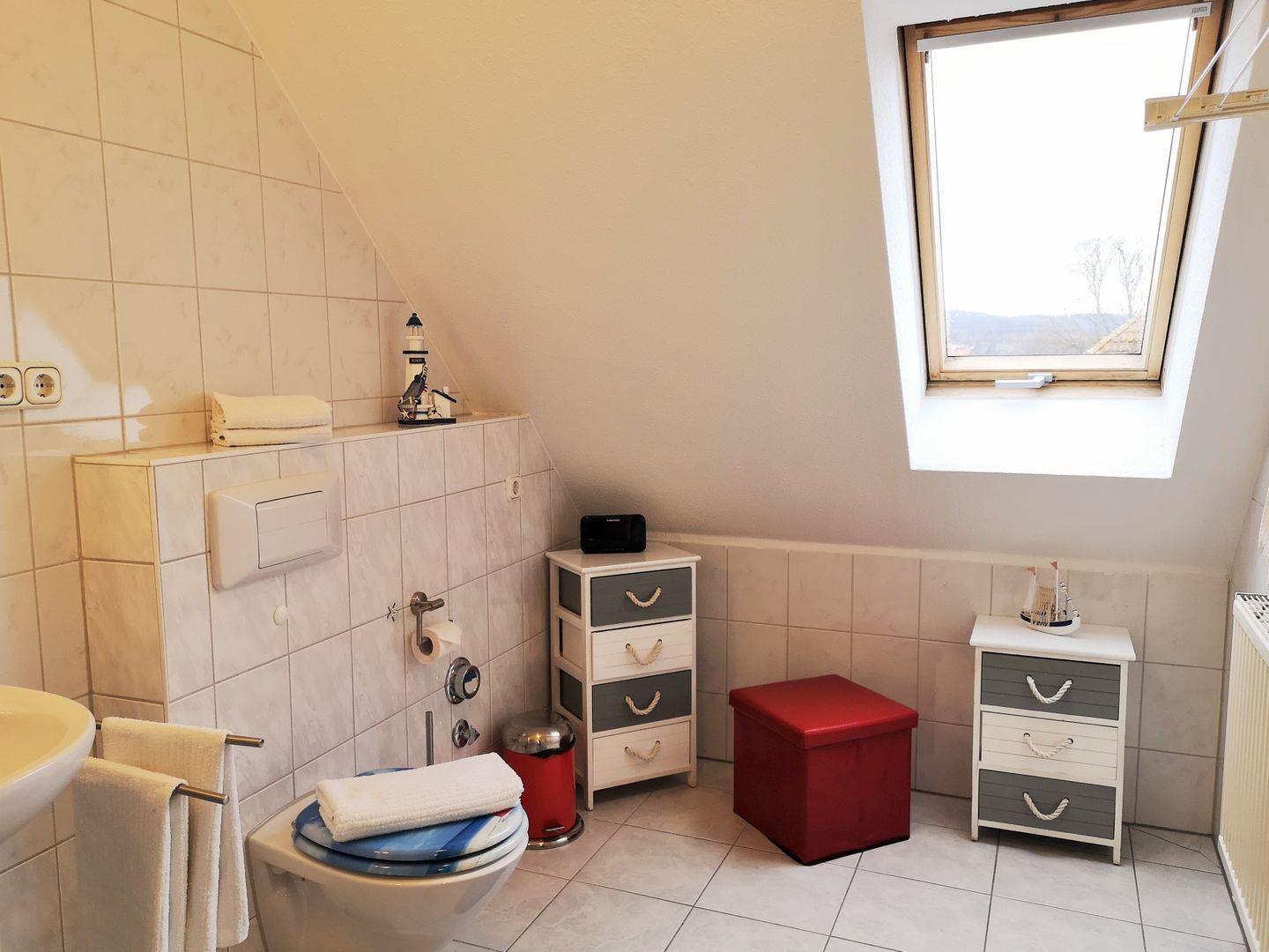 Das geräumige und helle Badezimmer (mit Tageslicht / Fenster) verfügt über eine Dusche, Waschbecken, WC, Radio sowie ausreichend Ablagemöglichkeiten.