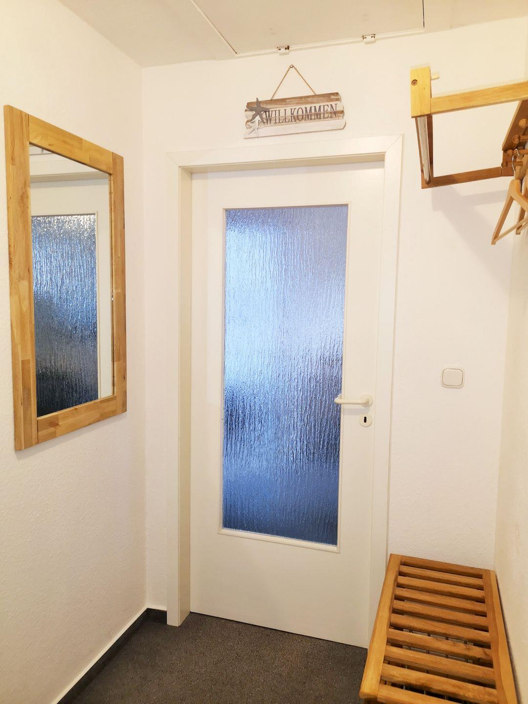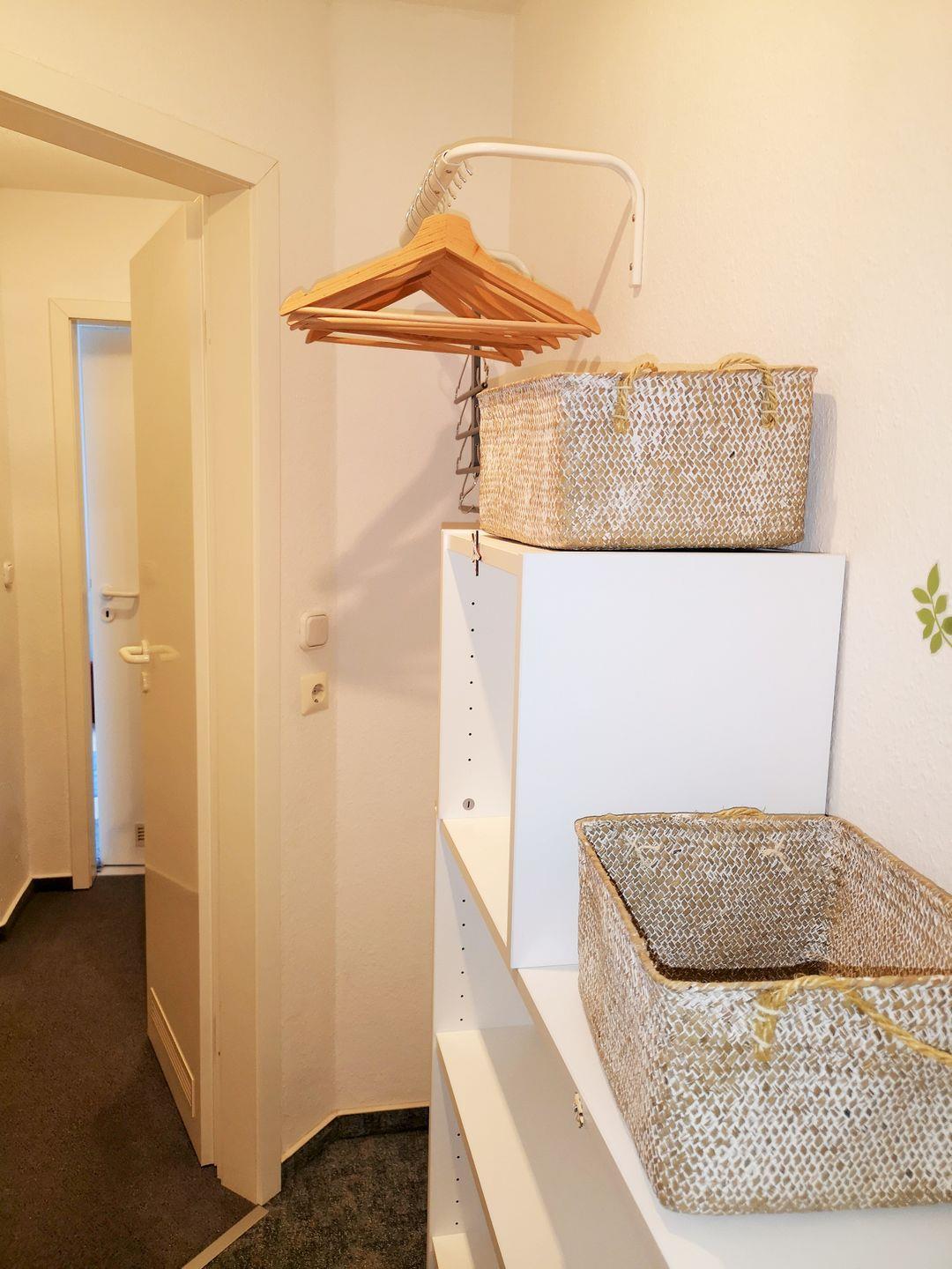 Ihre Schuhe und Jacken können Sie an der Garderobe (mit Spiegel) und dem Schuhboard im Flur der Wohnung unterbringen.