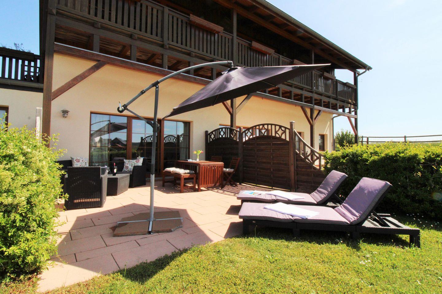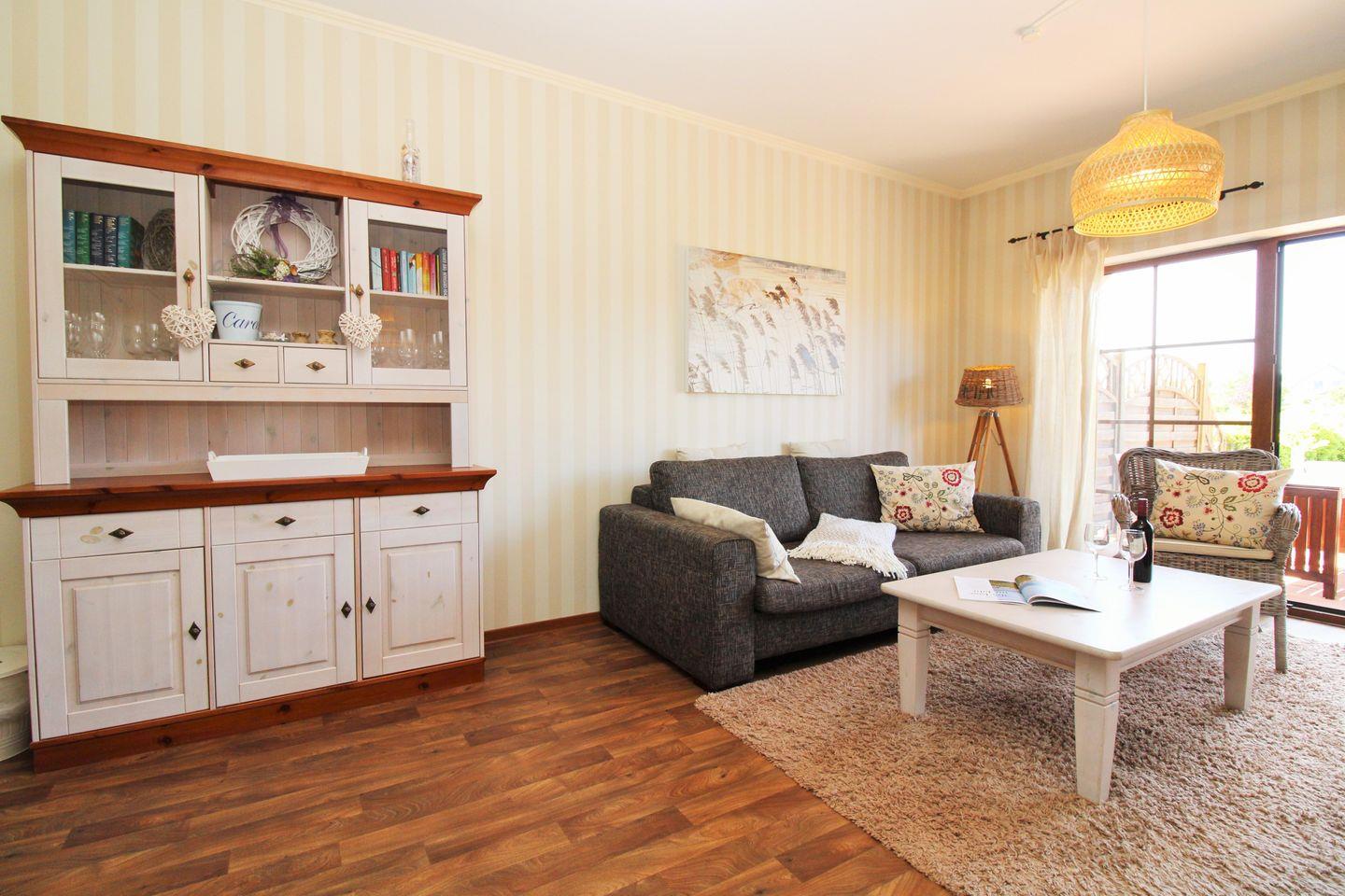 Das gemütliche und helle Wohn-/Esszimmer verfügt über eine separate Sitzgruppe mit bequemer Couch, Sessel und Couchtisch, einen separaten Esstisch mit 4 Stühlen sowie verschiedene Sideboards und Schränke. Vom Wohnzimmer aus haben Sie direkten Zugang zu der ca. 50 m² großen und sonnigen Terrasse (nach Süden ausgerichtet) mit Gartentisch und Stühlen sowie bequemen Loungemöbeln (Sessel und Liegen). Hier sitzen Sie entspannt und gemütlich mitten im Grünen und können abends bei einem guten Glas Wein in Ruhe die lauen Sommernächte genießen!