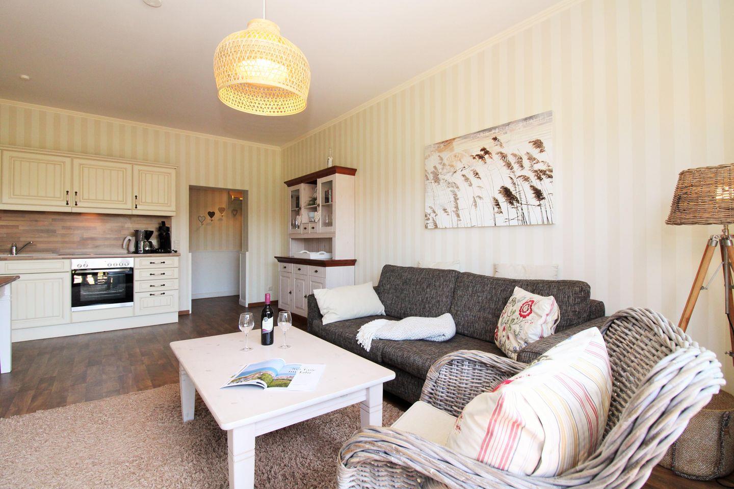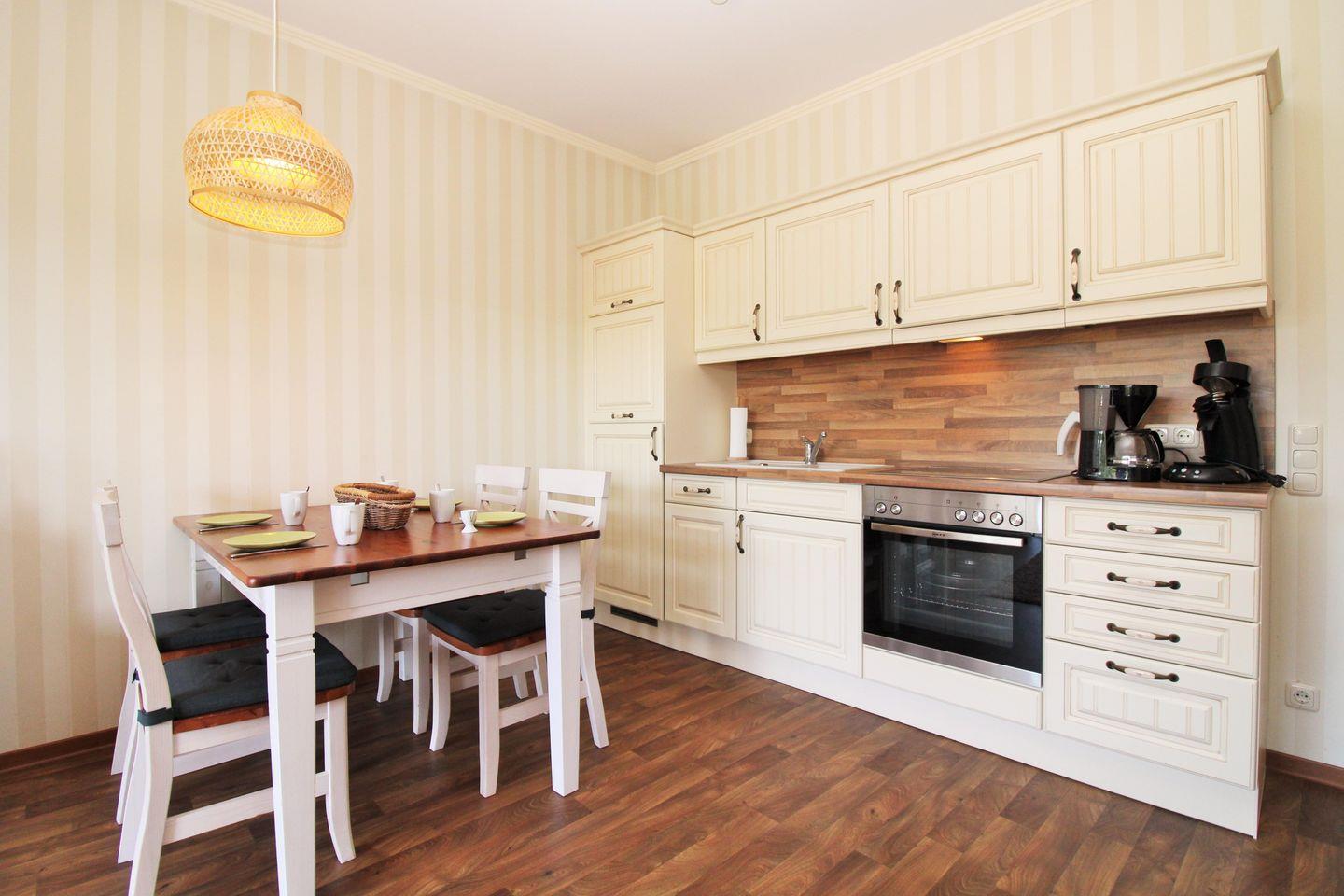 Der offene Küchenbereich beinhaltet eine voll ausgestattete Einbauküchenzeile mit 4-Zonen-Ceran-Kochfeld, Backofen, Dunstabzug, Mikrowelle, Kühlschrank mit Gefrierfach, Geschirrspüler, Kaffeemaschine, Wasserkocher und Toaster. Die Küche ist mit Geschirr, Gläsern, Besteck und Töpfen bestens und vollständig ausgestattet.
